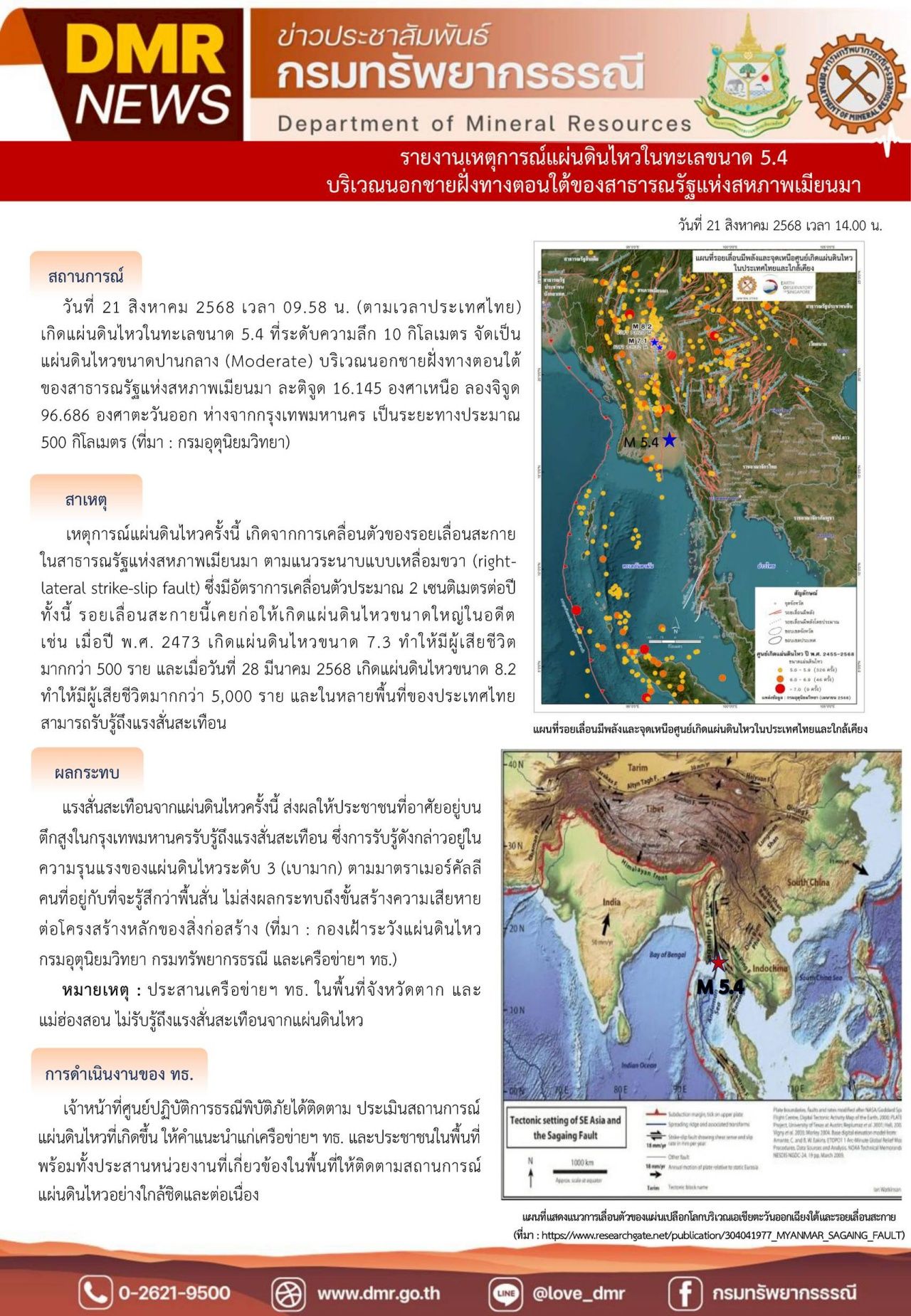 วันที่ 21 สิงหาคม 2568 เวลา 09.58 น. (ตามเวลาประเทศไทย) เกิดแผ่นดินไหวในทะเลขนาด 5.4 ที่ระดับความลึก 10 กิโลเมตร จัดเป็นแผ่นดินไหวขนาดปานกลาง (Moderate) บริเวณนอกชายฝั่งทางตอนใต้ของสาธารณรัฐแห่งสหภาพเมียนมา ละติจูด 16.145 องศาเหนือ ลองจิจูด 96.686 องศาตะวันออก ห่างจากกรุงเทพมหานคร เป็นระยะทางประมาณ 500 กิโลเมตร (ที่มา: กรมอุตุนิยมวิทยา)