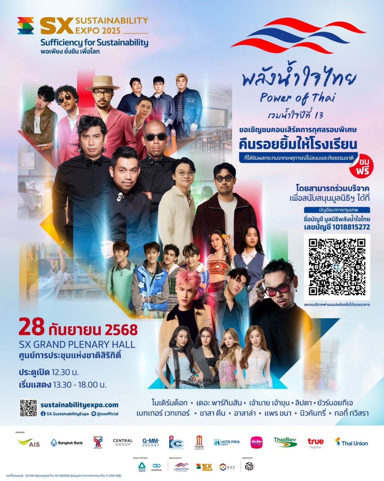 โดยตลอดระยะเวลา 13 ปี ที่ผ่านมา มูลนิธิพลังน้ำใจไทยได้เข้าไปฟื้นฟู ช่วยเหลือโรงเรียนในรูปแบบต่าง ๆ ที่เกิดขึ้นโดยตลอดอย่างต่อเนื่อง ที่ยังรวมถึงคณะผู้จัดงาน Sustainability Expo 2025 (SX2025) และเครือข่ายพันธมิตร ที่จะเชิญชวนทุกท่านให้มาร่วมพลังน้ำใจไทยเป็นหนึ่งเดียวกันในครั้งนี้ เปิดให้ชมฟรี และสามารถร่วมชมการถ่ายทอดสดผ่านช่องทางออนไลน์ SX 2025 และช่องทางสื่อออนไลน์ ของเครือข่ายพันธมิตร โดยผู้มีจิตศรัทธาสามารถร่วมบริจาคสมทบทุนได้ที่บัญชีธนาคารกรุงเทพ ชื่อบัญชี มูลนิธิพลังน้ำใจไทย เลขบัญชี 1018815272