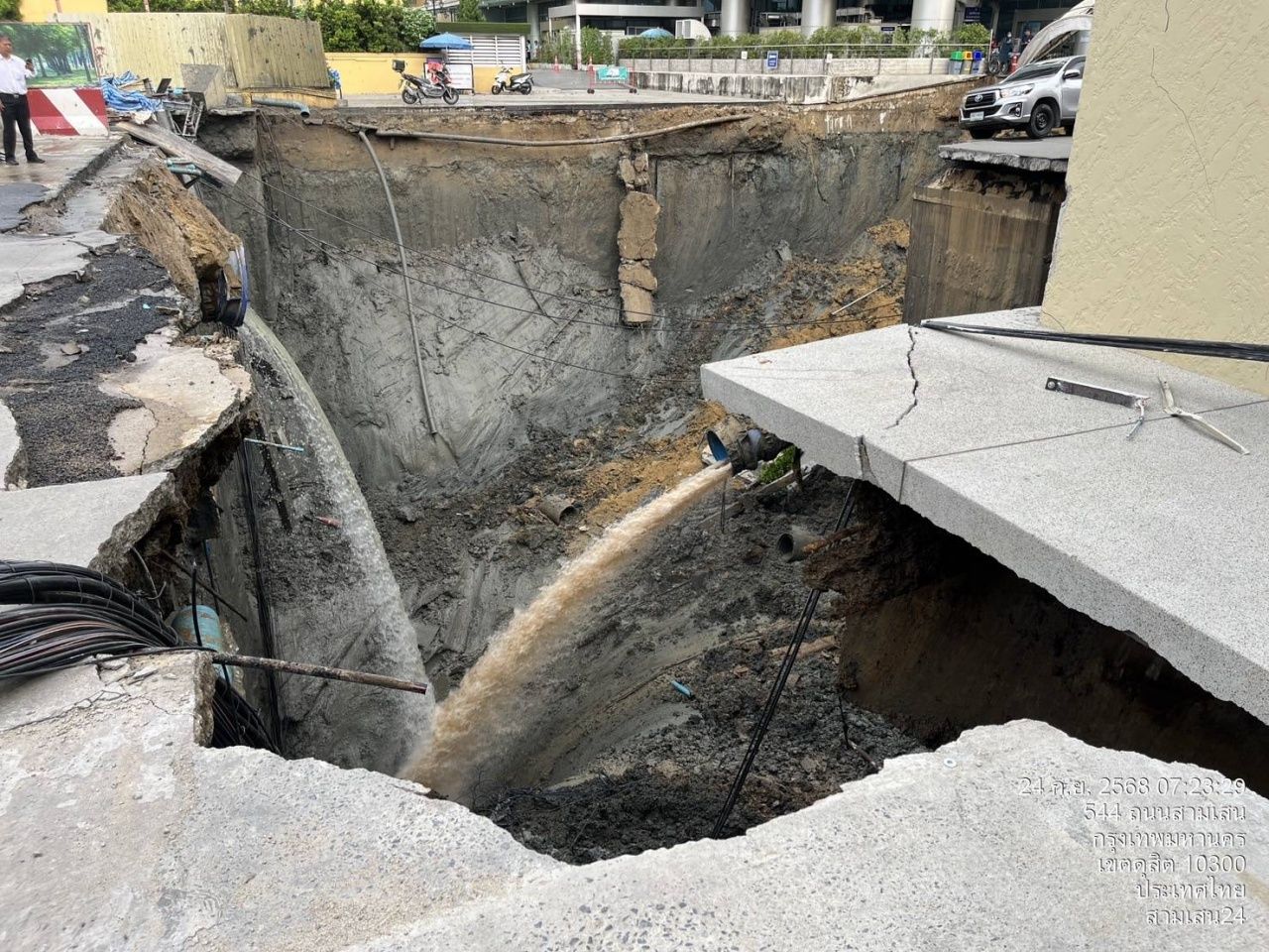 ที่เกิดเหตุ ลักษณะที่เกิดเหตุเป็นถนนทรุดตัวขนาดใหญ่ เป็นหลุมกว้าง 30 x 30 เมตร ลึก 50 เมตร ทรุดตัวเพิ่มขึ้นเรื่อยๆทั้งบริเวณหน้าโรงพยาบาลและหน้าสถานีตำรวจสามเสน เบื้องต้นไม่มีผู้ได้รับบาดเจ็บ