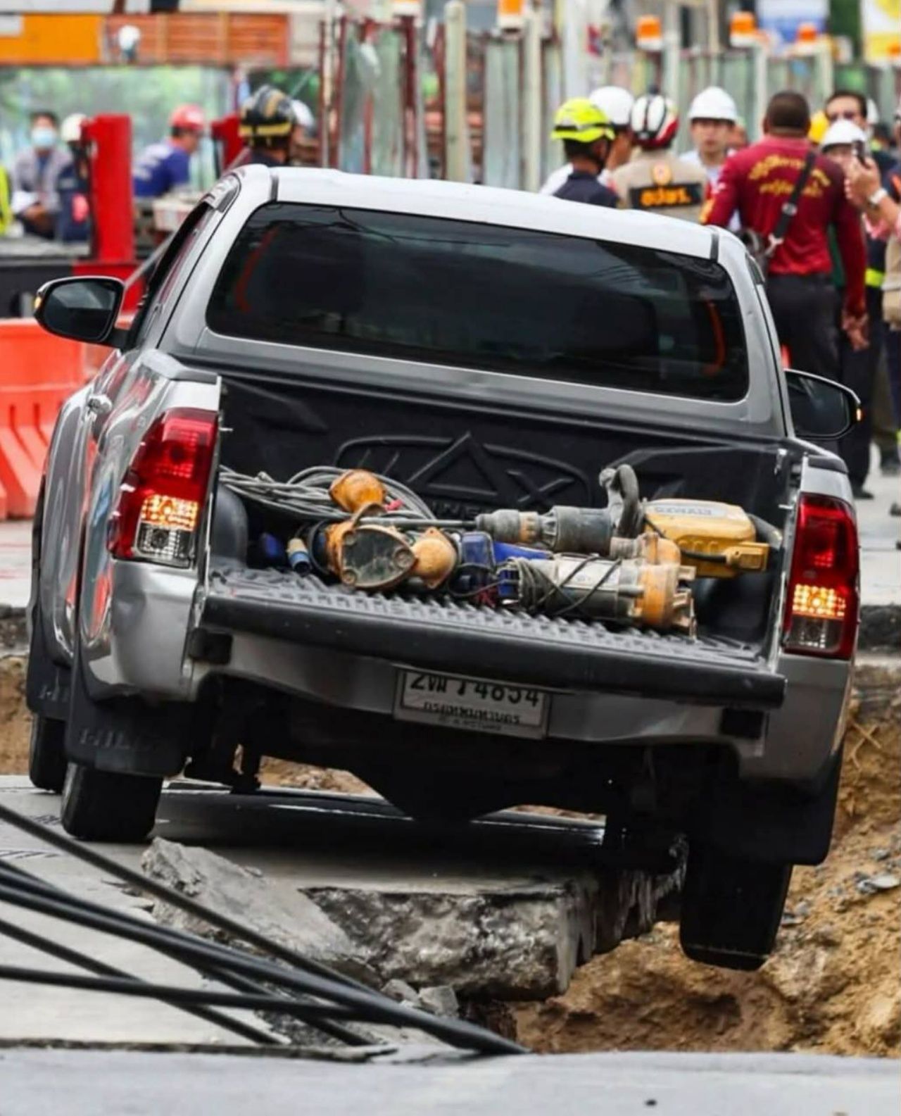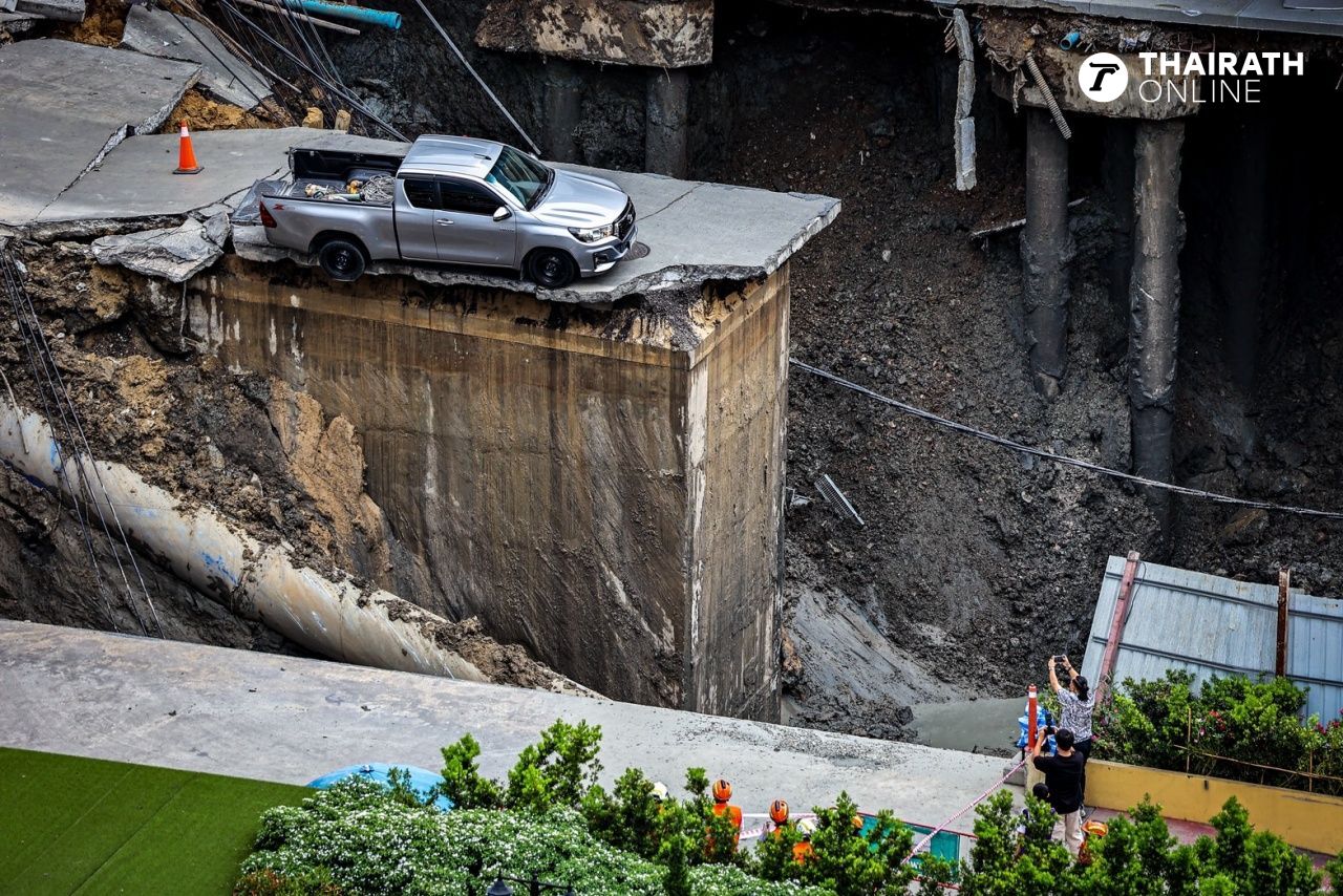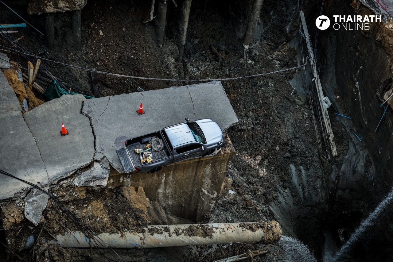 ถนนทรุดตัว หน้าโรงพยาบาลวชิรพยาบาล พบรถกระบะค้างเติ่ง คาดเป็นของทีมก่อสร้าง ยังไม่สามารถเคลื่อนย้ายได้ คนตามส่องทะเบียน