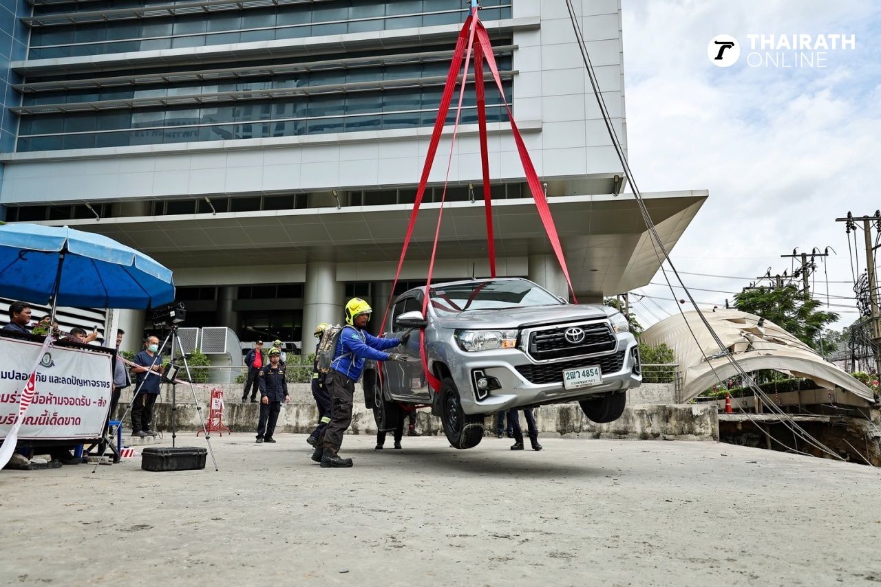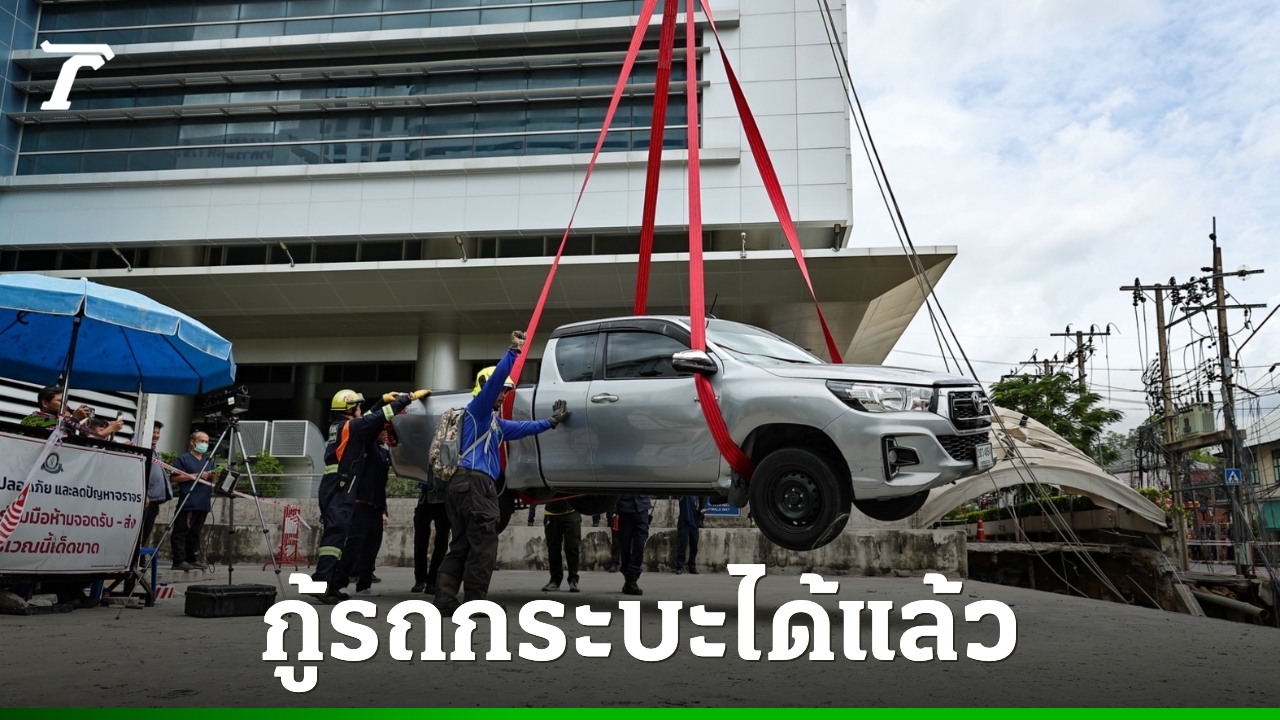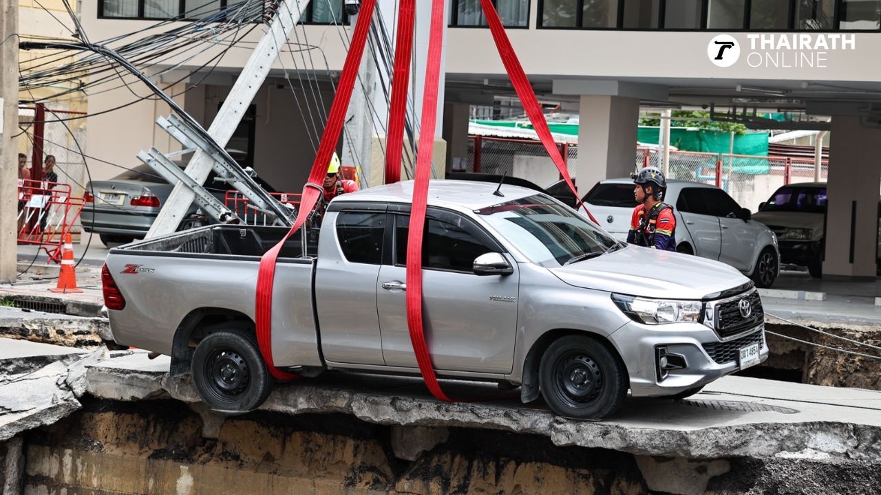 คืบหน้าถนนทรุดตัว หน้าโรงพยาบาลวชิรพยาบาล ล่าสุดเจ้าหน้าที่ใช้เครนยกรถกระบะที่ค้างเติ่งออกจากพื้นที่แล้ว
