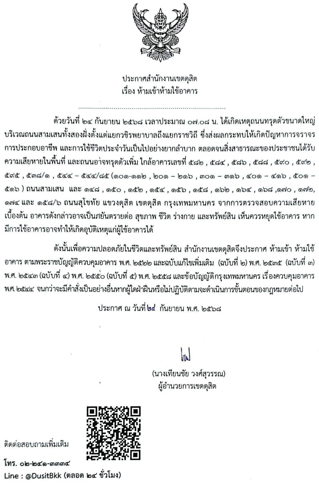 ดังนั้นเพื่อความปลอดภัยในชีวิตและทรัพย์สิน สำนักงานเขตดุสิตจึงประกาศ ห้ามเข้า ห้ามใช้อาคาร ตามพระราชบัญญัติควบคุมอาคาร พ.ศ. 2522 และฉบับแก้ไขเพิ่มเติม (ฉบับที่ 2) พ.ศ. 2535 (ฉบับที่ 3) พ.ศ. 2543 (ฉบับที่ 4) พ.ศ. 2550 (ฉบับที่ 5) พ.ศ. 2558 และข้อบัญญัติกรุงเทพมหานคร เรื่องควบคุมอาคาร พ.ศ. 2544 จนกว่าจะมีคำสั่งเป็นอย่างอื่นหากผู้ใดฝ่าฝืนหรือไม่ปฏิบัติตามจะดำเนินการขั้นตอนของกฎหมายต่อไป.