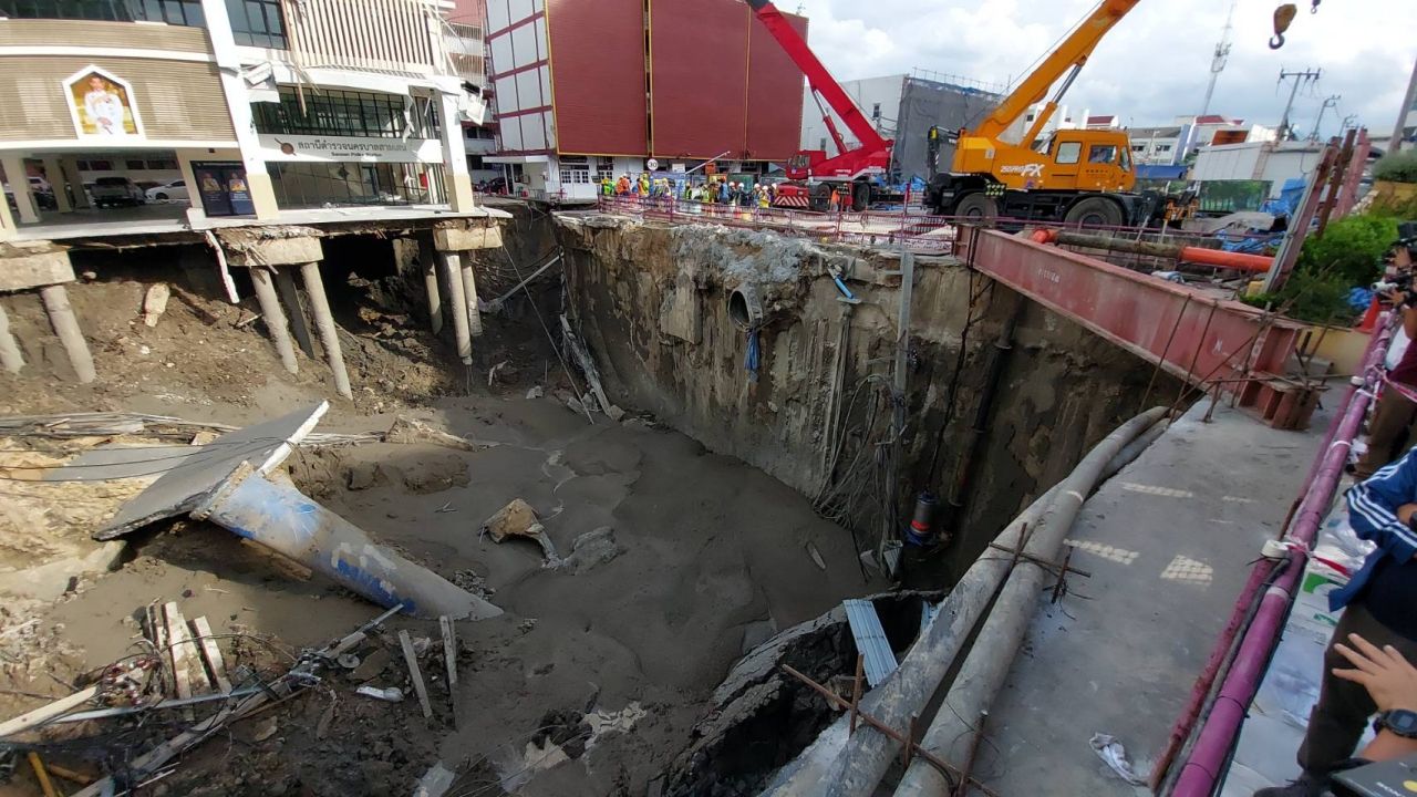 นอกจากนี้ได้นำเครื่องสูบน้ำขนาดใหญ่หย่อนลงไป ซึ่งมีอัตราการสูบ 0.25 ลูกบาศก์เมตรต่อวินาทีเพื่อสูบในกรณีที่มีปริมาณฝนตกเยอะภายในบ่อ เพื่อสูบออกผ่านด้านหน้าโรงพยาบาลและไปสู่บ่อถนนสังคโลก และเตรียมรถสูบสำรองไว้อีก 1 คัน ซึ่งอุปกรณ์ในการสูบสามารถปรับลดระดับความสูงได้ สำหรับศูนย์พักพิงชั่วคราวที่ศูนย์พัฒนาการชุมชนสวนอ้อยตอนนี้มีผู้อพยพพักอยู่จำนวน 6 คน ส่วนคนอื่นๆ ที่ไปพักตามโรงแรมทราบว่าทางเจ้าหน้าที่ รฟม. ก็ได้เข้าไปดูแล ซึ่งจุดเสี่ยงอื่นๆ เจ้าหน้าที่ยังไม่อนุญาตให้เข้าไป