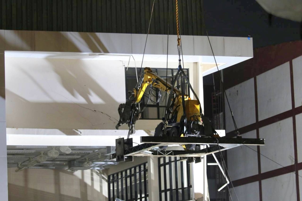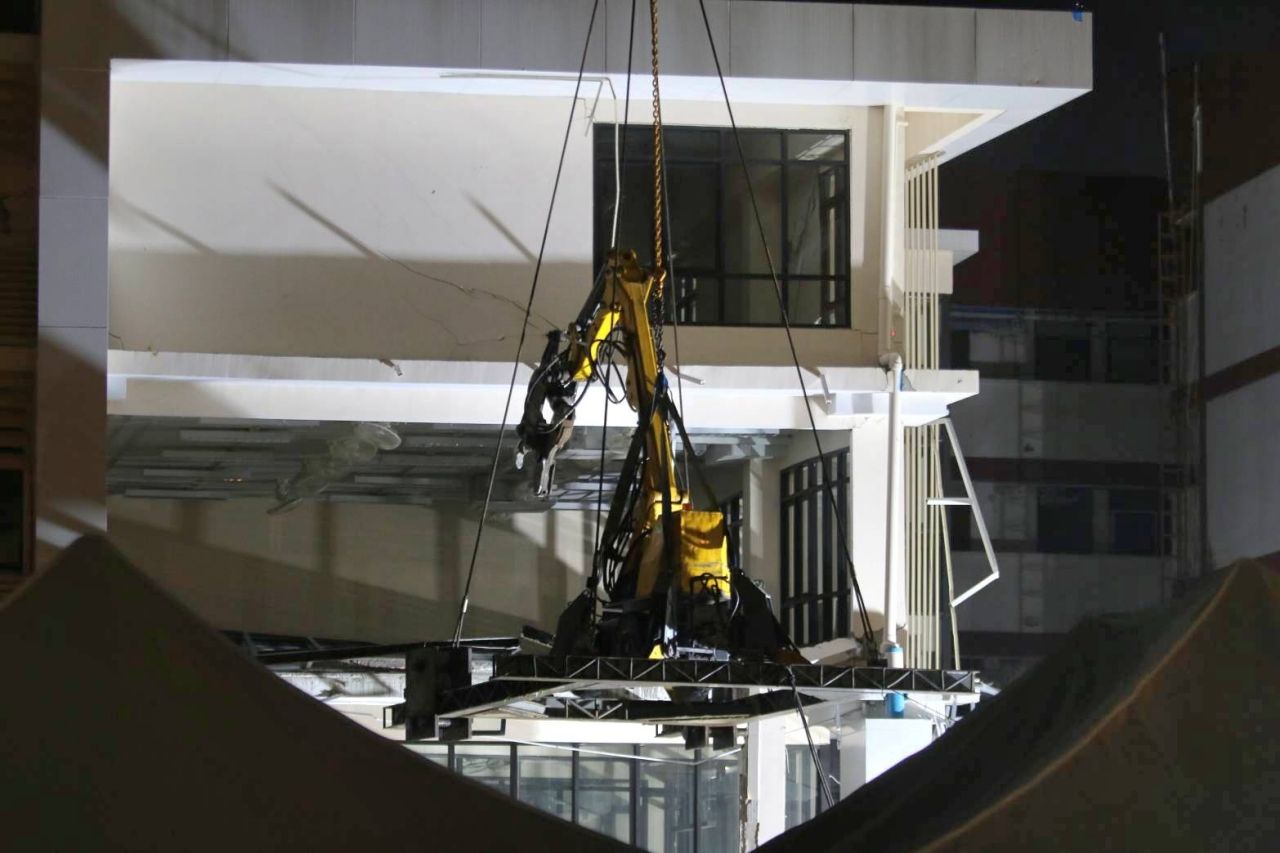 เจ้าหน้าที่ใช้รถเครนยกหุ่นยนต์รื้อถอนระยะไกล มีหัวเป็นตัวหนีบคล้ายก้ามปู ทำการรื้อถอนอาคาร สน.สามเสน เริ่มจากบริเวณชั้น 4 ไล่ลงมาที่ชั้น 3 ของอาคาร