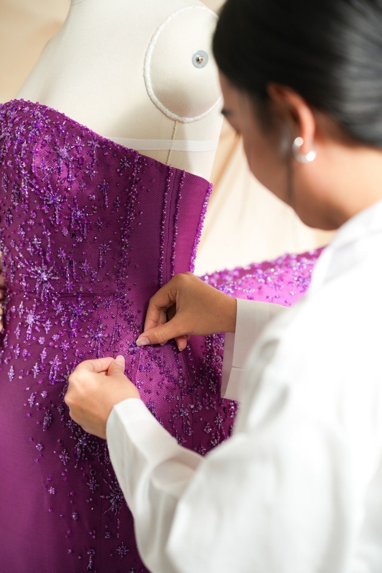 งานนี้ "มารายห์" เจาะจงเลือกใช้ผ้าไหมไทย เพื่อเป็นการยกย่องงานฝีมือของชาติไทย ในโทนสีม่วงชมพูที่เธอโปรดปราน เนรมิตขึ้นผ่านงานตัดเย็บเสื้อผ้าชั้นสูง ใช้ผ้าไหมลายลูกแก้วสีม่วงมาเจนต้า (สีเกสรชมพู่มะเหมี่ยว) อันหรูหรา จากมูลนิธิส่งเสริมศิลปาชีพฯ พร้อมดีเทลช่วงหลังขึ้นโครงจีบผ้าเป็นช่อดอกไม้โดดเด่นยามเคลื่อนไหว