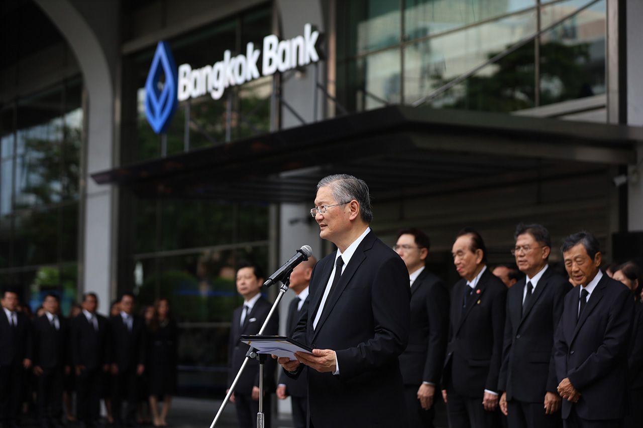 จากนั้น กรรมการผู้จัดการใหญ่ ได้กล่าวนำแสดงความอาลัย และนำยืนสงบนิ่งเป็นเวลา 93 วินาที ณ ลานด้านหน้าอาคาร ธนาคารกรุงเทพสำนักงานใหญ่ ถนนสีลม