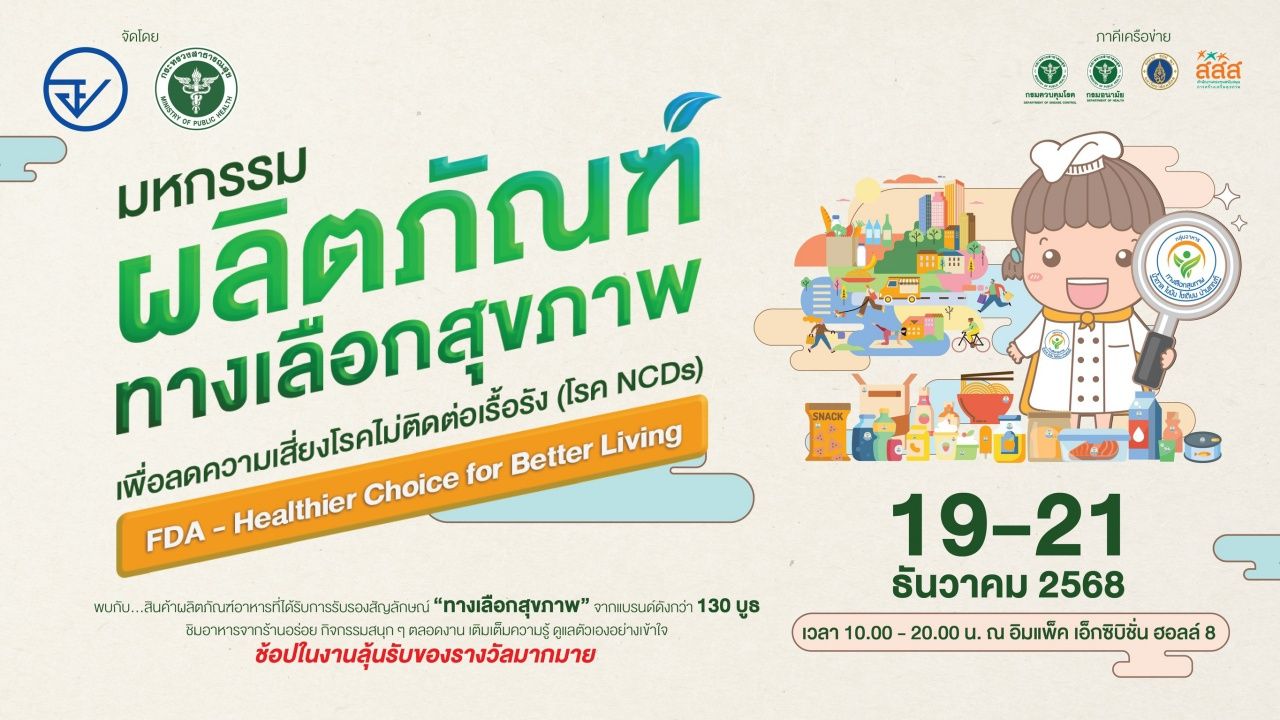 งานมหกรรมผลิตภัณฑ์ทางเลือกสุขภาพ (Healthier Choice Expo) ที่ อย. ตั้งใจจัดขึ้นในระหว่างวันที่ 19-21 ธ.ค. 2568 ณ อิมแพ็ค เอ็กซิบิชั่น ฮอลล์ 8 เมืองทองธานี เพื่อให้ประชาชนเข้าถึงข้อมูลสุขภาพที่ถูกต้อง และเลือกซื้อผลิตภัณฑ์อาหารที่ดีต่อสุขภาพได้ง่ายขึ้น ผ่านสัญลักษณ์โภชนาการ "ทางเลือกสุขภาพ" ซึ่งเป็นตัวช่วยสำคัญในการตัดสินใจเลือกผลิตภัณฑ์ที่ผ่านการตรวจสอบแล้วว่า มีปริมาณน้ำตาล ไขมัน และโซเดียม อยู่ในเกณฑ์ที่เหมาะสม งานนี้จึงเป็นอีกก้าวหนึ่งในการร่วมกันสร้างสังคมไทยที่แข็งแรง ลดความเสี่ยงการเกิดโรค NCDs และยกระดับคุณภาพชีวิตของประชาชน