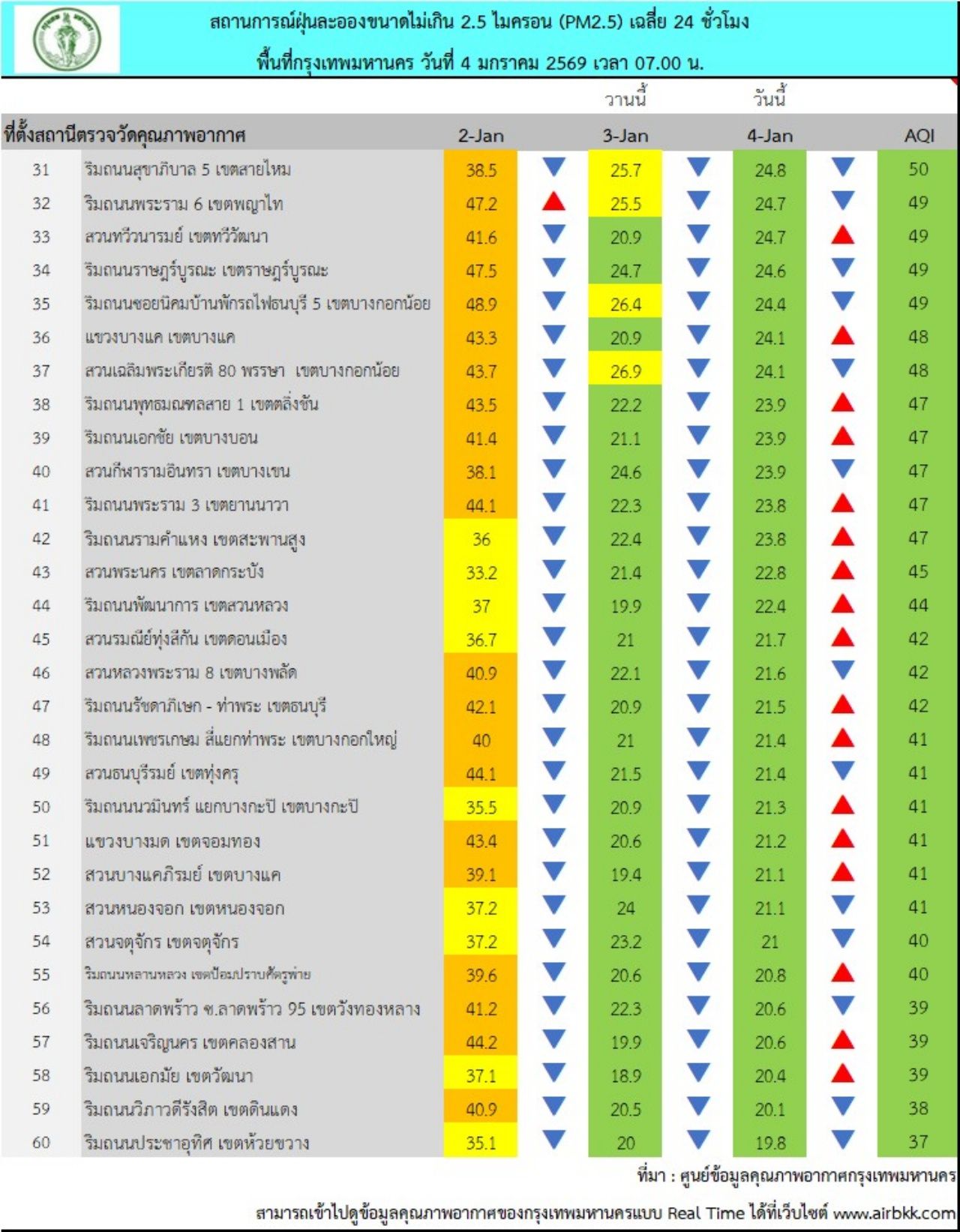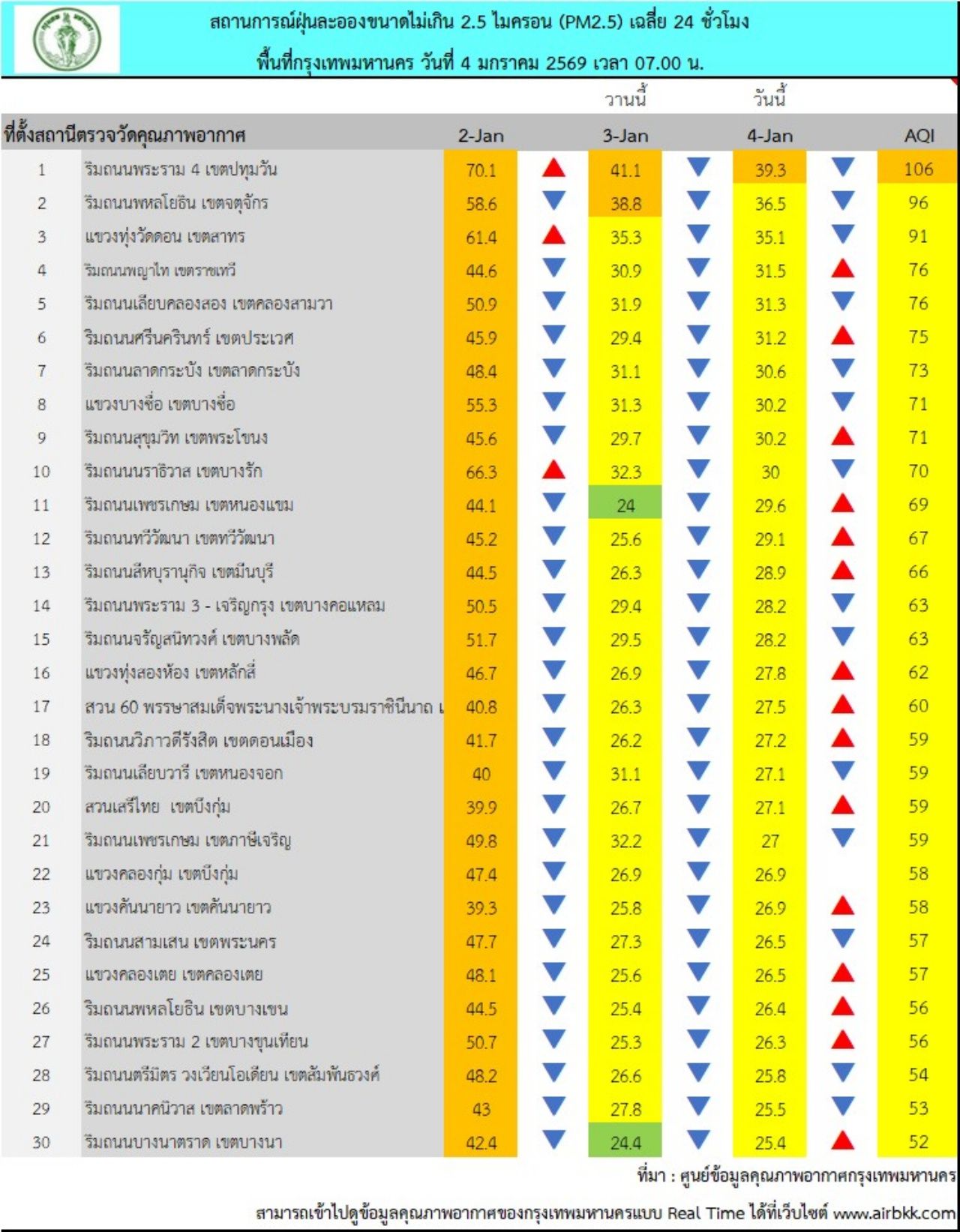 วันที่ 4 ม.ค. 69 ศูนย์ข้อมูลคุณภาพอากาศกรุงเทพมหานคร สรุปผลการตรวจวัด PM 2.5 ณ เวลา 07.00 น. ตรวจวัดค่าฝุ่นละออง PM 2.5 ได้ในช่วง 18.2-39.3 ไมโครกรัม/ลูกบาศก์เมตร (มคก./ลบ.ม.) โดยมีแนวโน้มลดลง เมื่อเทียบกับเมื่อวานในช่วงเวลาเดียวกัน และพบว่าเกินมาตรฐานอยู่ในระดับสีส้ม เริ่มมีผลกระทบต่อสุขภาพ (มาตรฐานไม่เกิน 37.5 มคก./ลบ.ม.) จำนวน 1 พื้นที่ คือเขตปทุมวัน หน้าห้างสามย่านมิตรทาวน์ มีค่าเท่ากับ 39.3 มคก./ลบ.ม