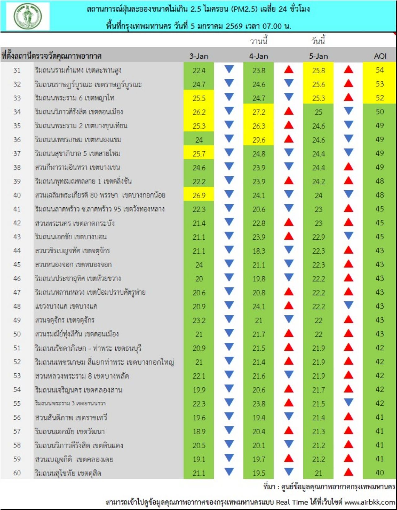 วันที่ 5 มกราคม 2568 ศูนย์ข้อมูลคุณภาพอากาศกรุงเทพมหานคร รายงานสถานการณ์ฝุ่นละอองขนาดไม่เกิน 2.5 ไมครอน (PM 2.5) ของสถานีตรวจวัดคุณภาพอากาศของกรุงเทพมหานคร เวลา 07.00 น. ค่าเฉลี่ย 24 ชั่วโมง ของฝุ่นละอองขนาดไม่เกิน 2.5 ไมครอน (PM 2.5) ตรวจวัดได้ 19.3-40.8 ไมโครกรัม/ลูกบาศก์เมตร (มคก./ลบ.ม.) พบว่าเกินมาตรฐานอยู่ในระดับสีส้ม เริ่มมีผลกระทบต่อสุขภาพ (มาตรฐานไม่เกิน 37.5 มคก./ลบ.ม.) จำนวน 2 พื้นที่ คือ