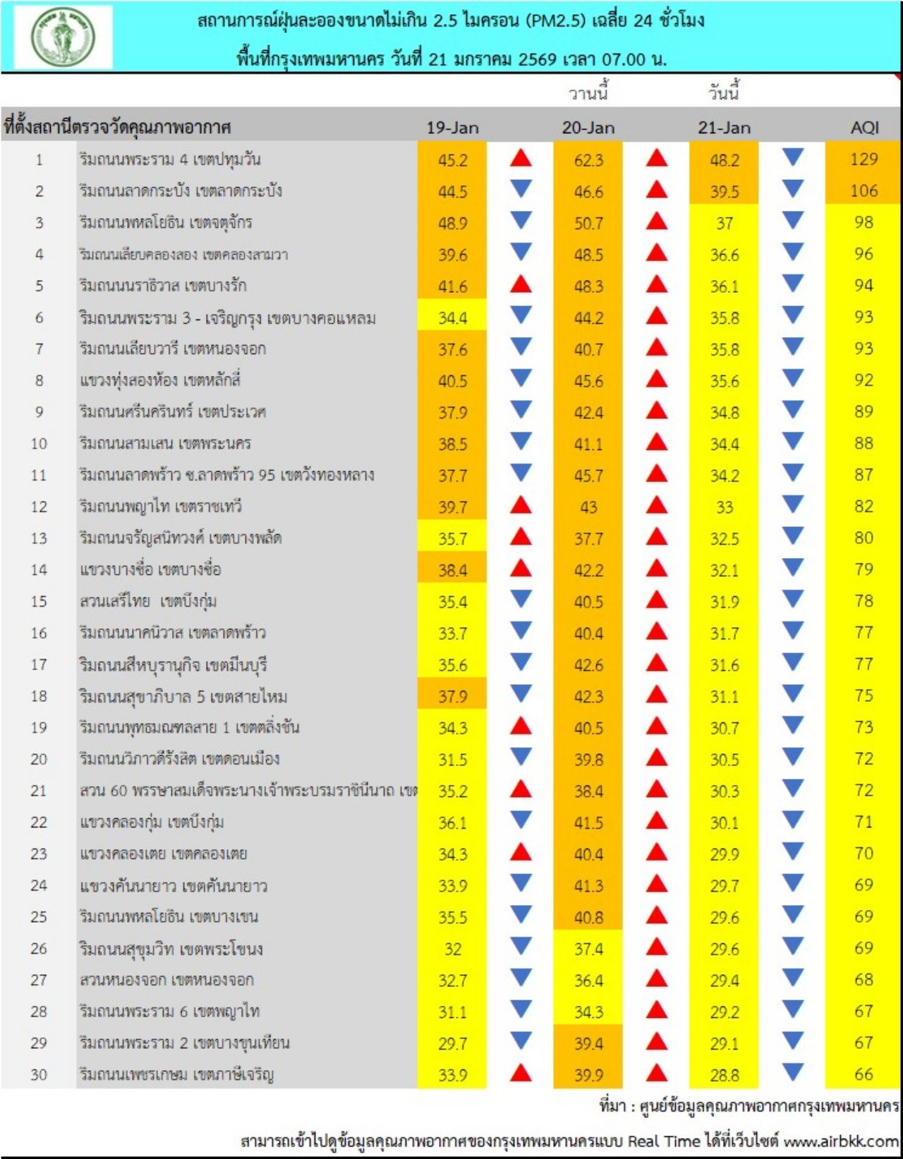 วันที่ 21 ม.ค. 69 ศูนย์ข้อมูลคุณภาพอากาศกรุงเทพมหานคร รายงานสถานการณ์ฝุ่นละอองขนาดไม่เกิน 2.5 ไมครอน (PM 2.5) ของสถานีตรวจวัดคุณภาพอากาศของกรุงเทพมหานคร เวลา 07.00 น. ค่าเฉลี่ย 24 ชั่วโมง ของฝุ่นละอองขนาดไม่เกิน 2.5 ไมครอน (PM 2.5) ตรวจวัดได้ 20.3-48.2 ไมโครกรัม/ลูกบาศก์เมตร (มคก./ลบ.ม.) พบว่าเกินมาตรฐานอยู่ในระดับสีส้ม เริ่มมีผลกระทบต่อสุขภาพ (มาตรฐานไม่เกิน 37.5 มคก./ลบ.ม.) จำนวน 2 พื้นที่ คือ