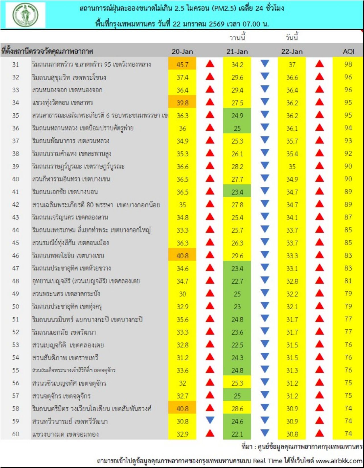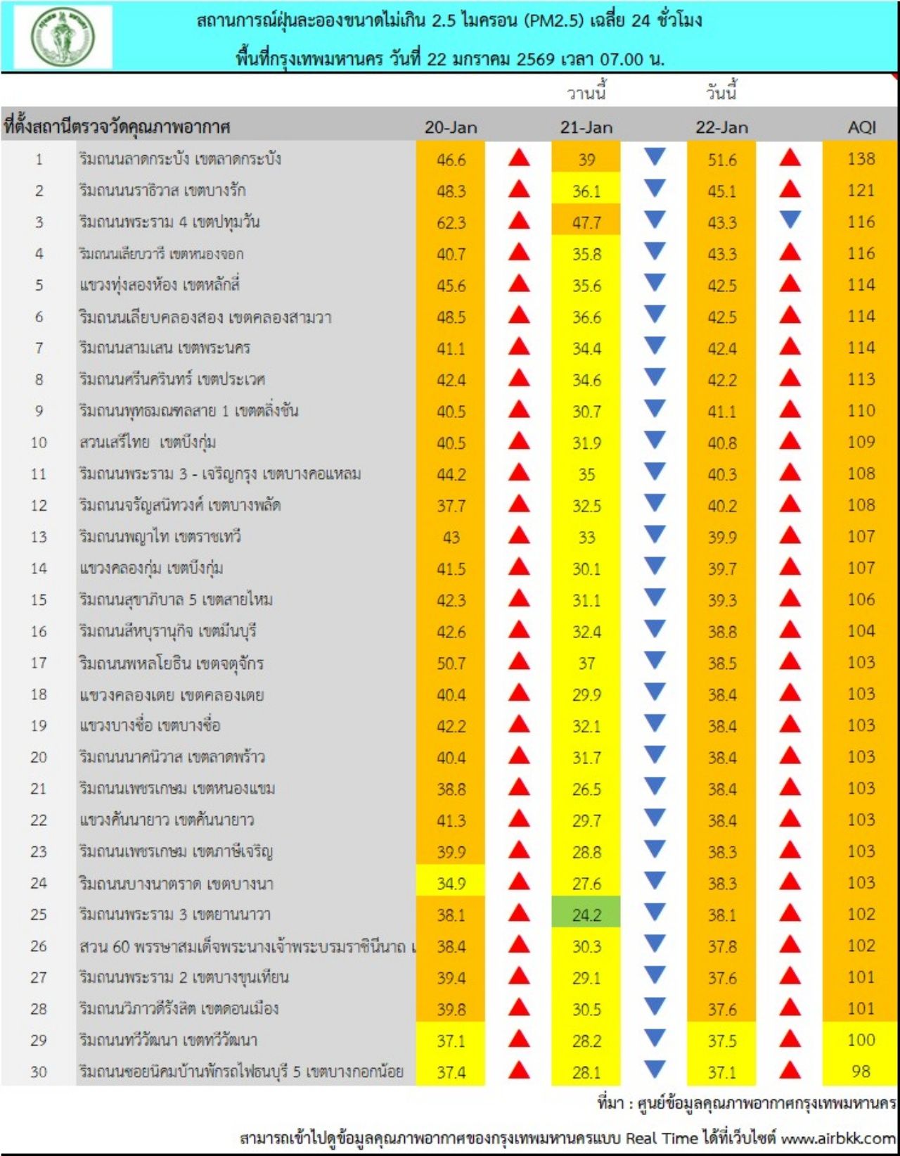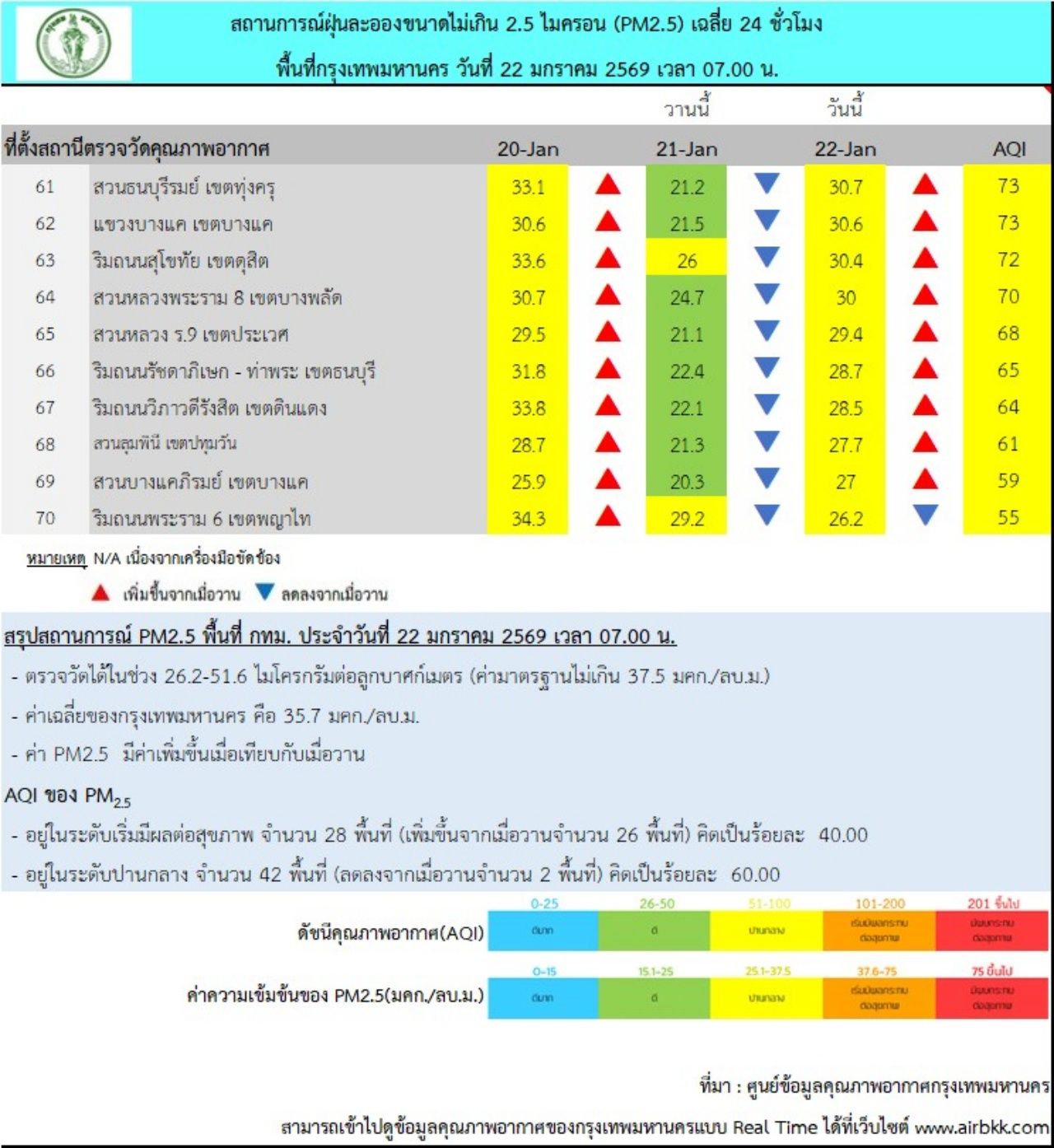 วันที่ 22 ม.ค. 69 ศูนย์ข้อมูลคุณภาพอากาศกรุงเทพมหานคร รายงานสถานการณ์ฝุ่นละอองขนาดไม่เกิน 2.5 ไมครอน (PM 2.5) ของสถานีตรวจวัดคุณภาพอากาศของกรุงเทพมหานคร เวลา 07.00 น. ค่าเฉลี่ย 24 ชั่วโมง ของฝุ่นละอองขนาดไม่เกิน 2.5 ไมครอน (PM 2.5) ตรวจวัดได้ 26.2-51.6 ไมโครกรัม/ลูกบาศก์เมตร (มคก./ลบ.ม.) พบว่าเกินมาตรฐานอยู่ในระดับสีส้ม เริ่มมีผลกระทบต่อสุขภาพ (มาตรฐานไม่เกิน 37.5 มคก./ลบ.ม.) จำนวน 28 พื้นที่ คือ