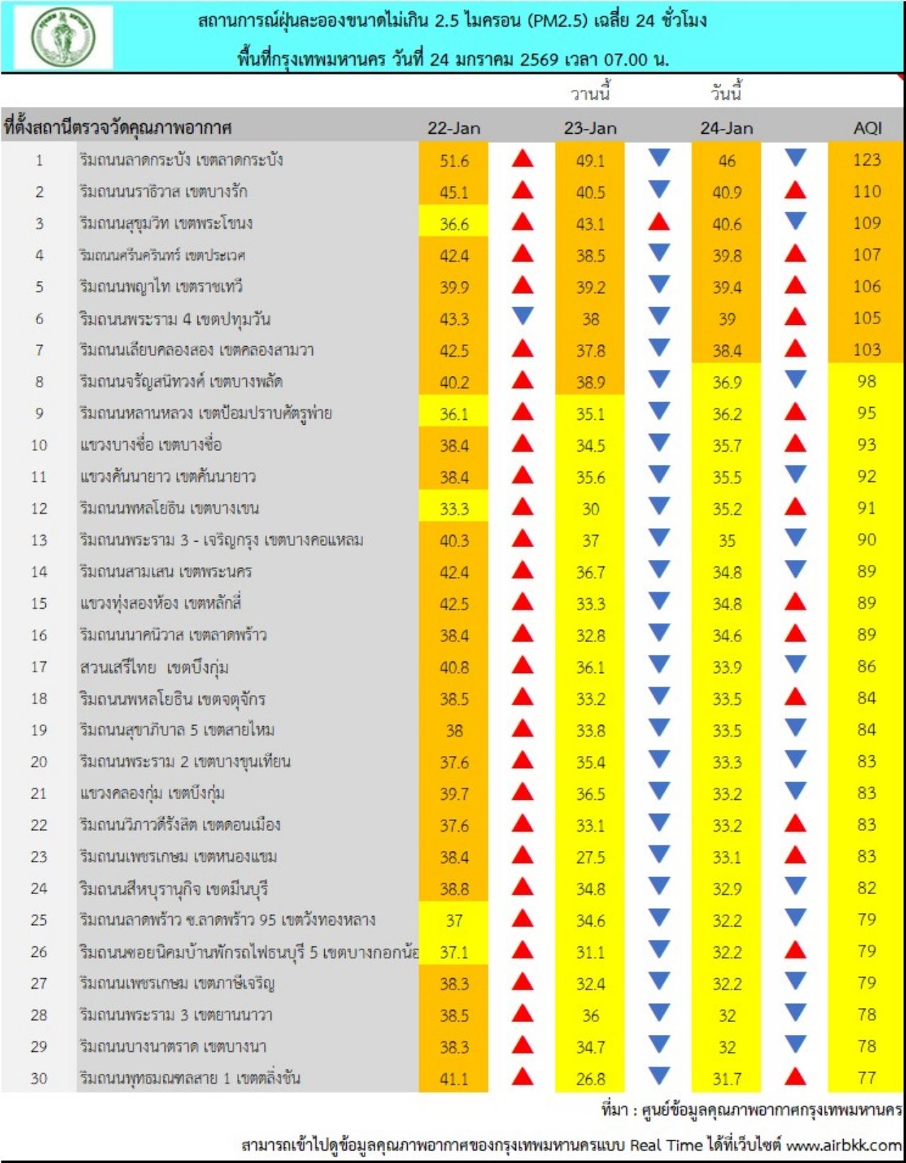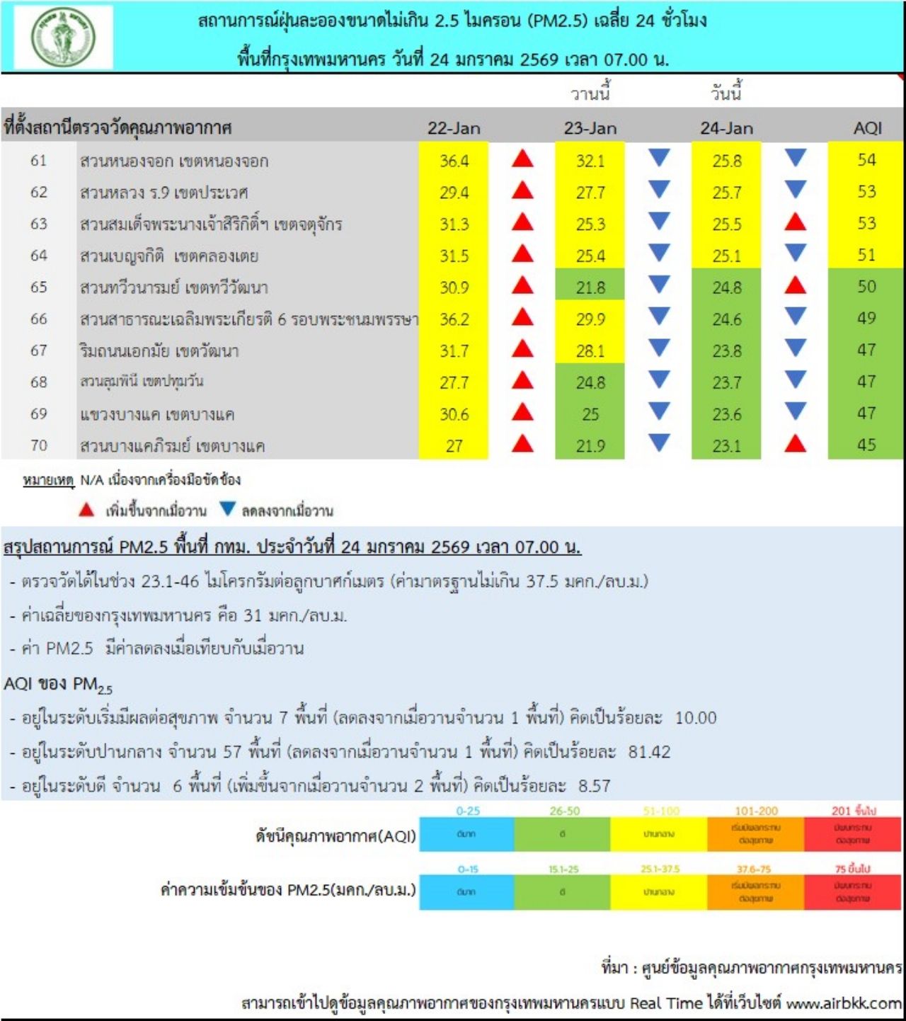 วันที่ 24 มกราคม 2569 ศูนย์ข้อมูลคุณภาพอากาศกรุงเทพมหานคร รายงานสถานการณ์ฝุ่นละอองขนาดไม่เกิน 2.5 ไมครอน (PM 2.5) ของสถานีตรวจวัดคุณภาพอากาศของกรุงเทพมหานคร เวลา 07.00 น. ค่าเฉลี่ย 24 ชั่วโมง ของฝุ่นละอองขนาดไม่เกิน 2.5 ไมครอน (PM 2.5) ตรวจวัดได้ 23.1-46 ไมโครกรัม/ลูกบาศก์เมตร (มคก./ลบ.ม.) พบว่าเกินมาตรฐานอยู่ในระดับสีส้ม เริ่มมีผลกระทบต่อสุขภาพ (มาตรฐานไม่เกิน 37.5 มคก./ลบ.ม.) จำนวน 7 พื้นที่ คือ