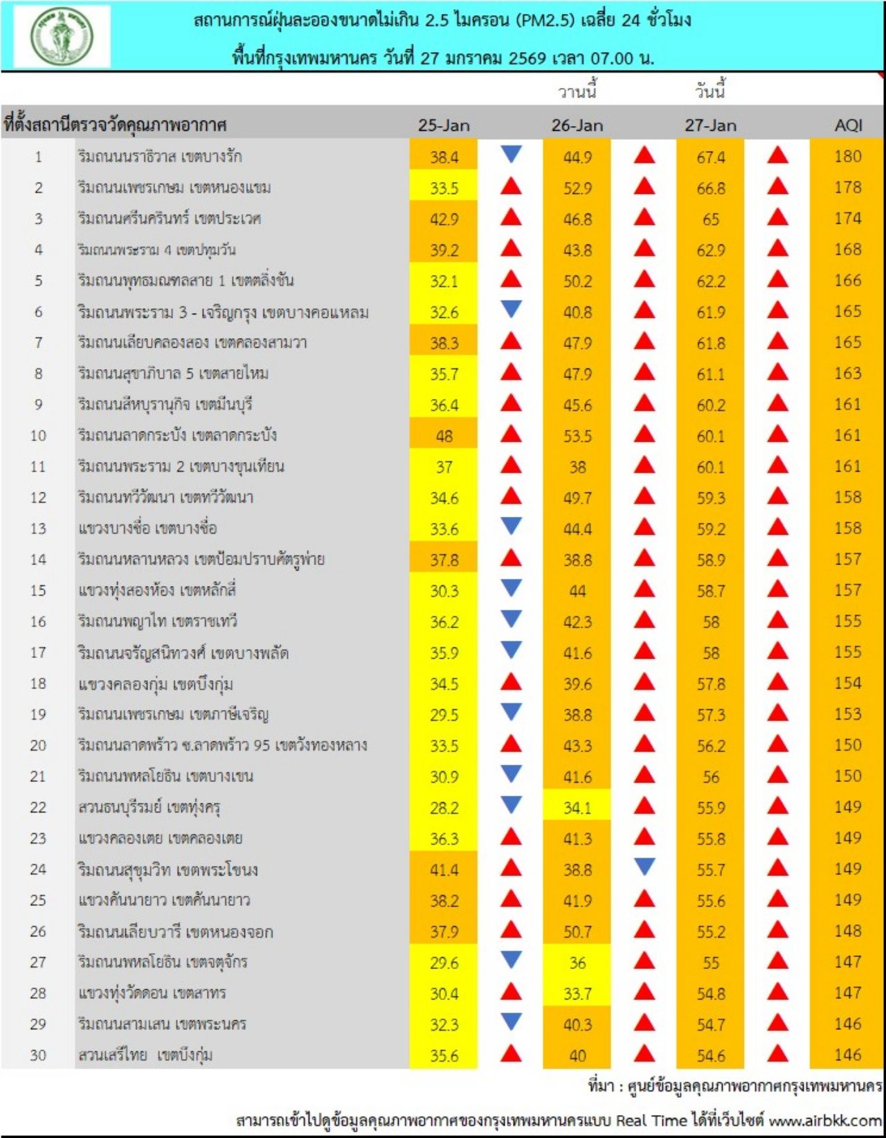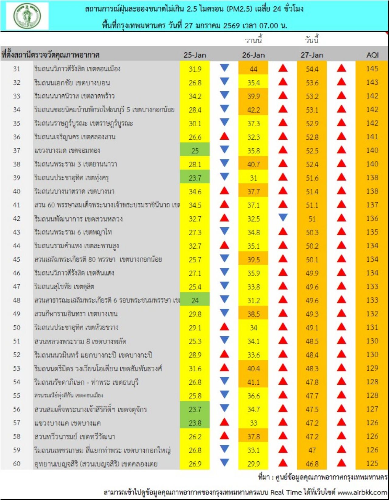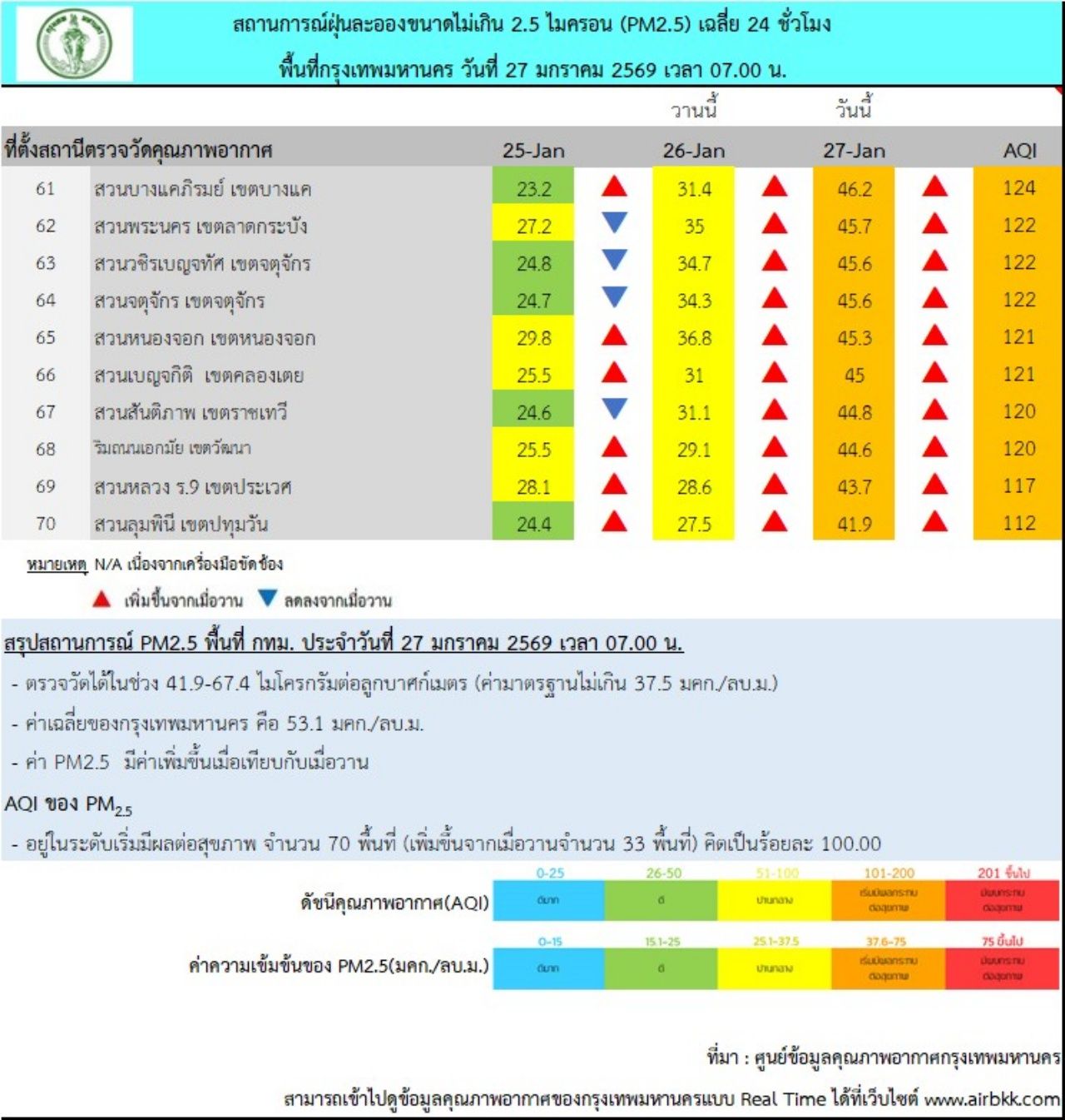 วันที่ 27 ม.ค. 69 ศูนย์ข้อมูลคุณภาพอากาศกรุงเทพมหานคร รายงานสถานการณ์ฝุ่นละอองขนาดไม่เกิน 2.5 ไมครอน (PM 2.5) ของสถานีตรวจวัดคุณภาพอากาศของกรุงเทพมหานคร เวลา 07.00 น. ค่าเฉลี่ย 24 ชั่วโมง ของฝุ่นละอองขนาดไม่เกิน 2.5 ไมครอน (PM 2.5) ตรวจวัดได้ 41.9-67.4 ไมโครกรัม/ลูกบาศก์เมตร (มคก./ลบ.ม.) พบว่าเกินมาตรฐานอยู่ในระดับสีส้ม เริ่มมีผลกระทบต่อสุขภาพ (มาตรฐานไม่เกิน 37.5 มคก./ลบ.ม.) จำนวน 70 พื้นที่ คือ