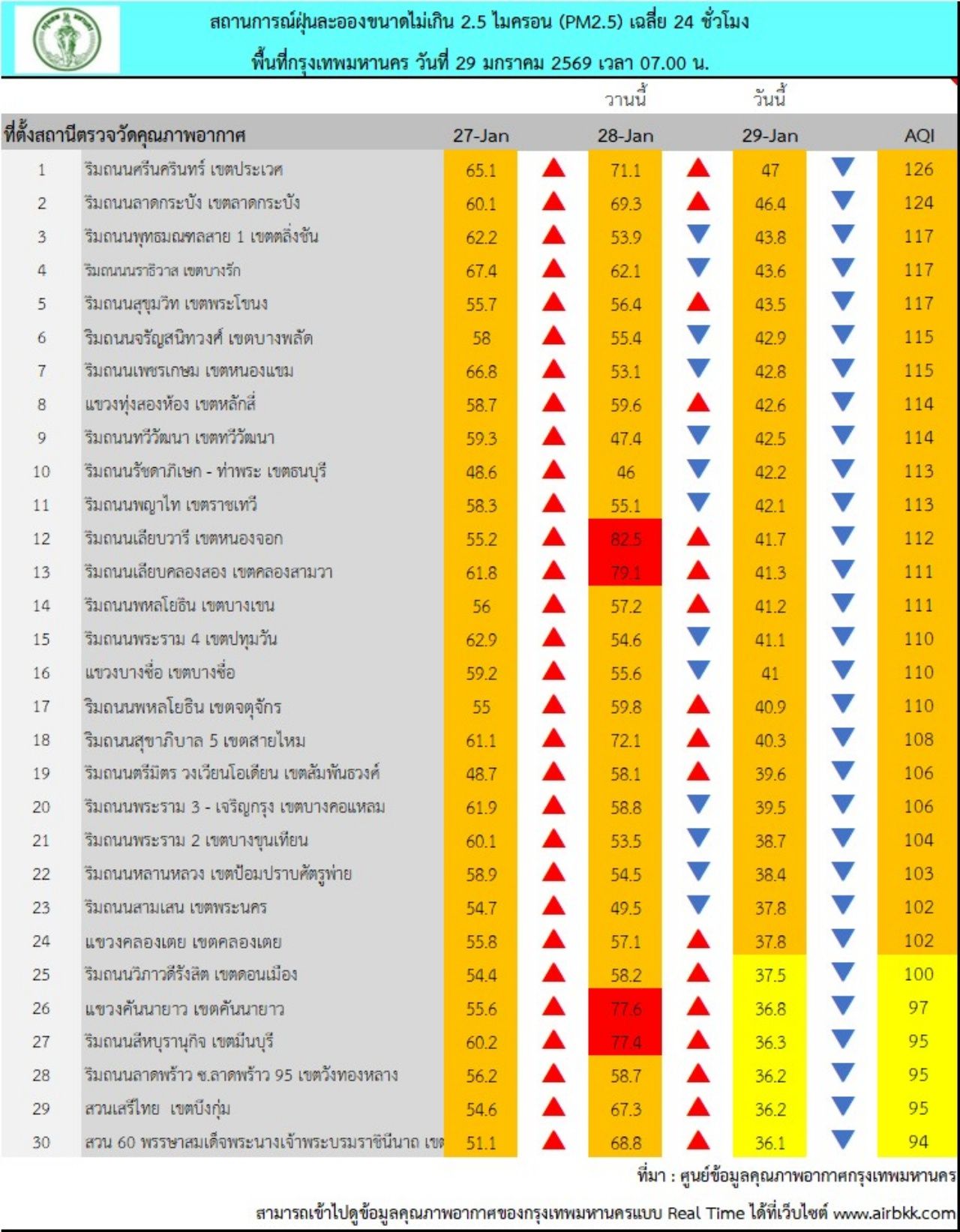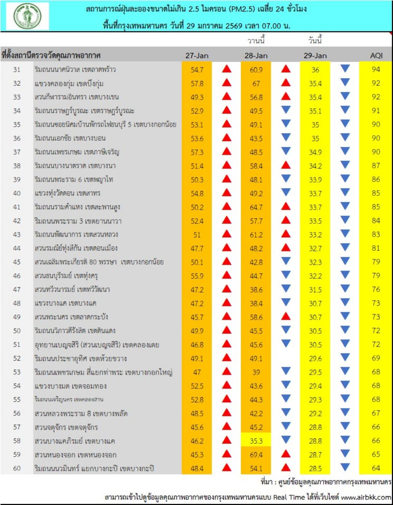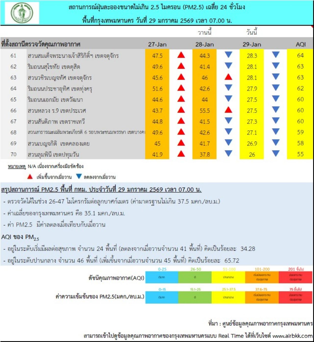 วันที่ 29 ม.ค. 69 ศูนย์ข้อมูลคุณภาพอากาศกรุงเทพมหานคร รายงานสถานการณ์ฝุ่นละอองขนาดไม่เกิน 2.5 ไมครอน (PM 2.5) ของสถานีตรวจวัดคุณภาพอากาศของกรุงเทพมหานคร เวลา 07.00 น. ค่าเฉลี่ย 24 ชั่วโมง ของฝุ่นละอองขนาดไม่เกิน 2.5 ไมครอน (PM 2.5) ตรวจวัดได้ 26-47 ไมโครกรัม/ลูกบาศก์เมตร (มคก./ลบ.ม.) พบว่าเกินมาตรฐานอยู่ในระดับสีส้ม เริ่มมีผลกระทบต่อสุขภาพ (มาตรฐานไม่เกิน 37.5 มคก./ลบ.ม.) จำนวน 24 พื้นที่ คือ