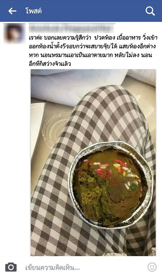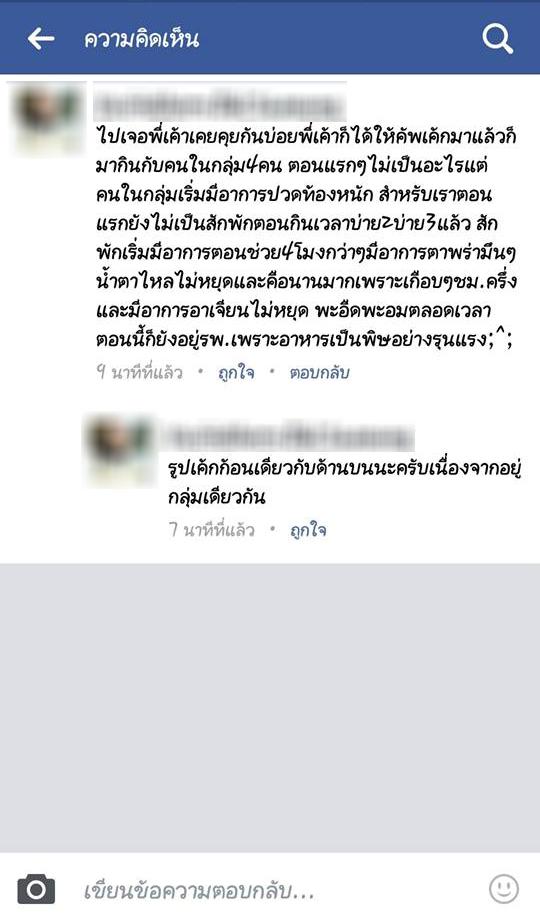 ผู้ใช้เฟซบุ๊กอีกคน เข้ามาคอมเมนต์ระบุข้อความว่า “ไปเจอพี่เค้า เคยคุยกันบ่อย พี่เค้าก็ได้ให้คัพเค้กมาแล้วก็มากินกับคนในกลุ่ม 4 คน ตอนแรกๆ ไม่เป็นอะไร แต่คนในกลุ่มเริ่มมีอาการปวดท้องหนัก และมีอาการอาเจียนไม่หยุด พะอืดพะอมตลอดเวลา ตอนนี้ก็ยังอยู่ รพ.เพราะอาหารเป็นพิษอย่างรุนแรง”
