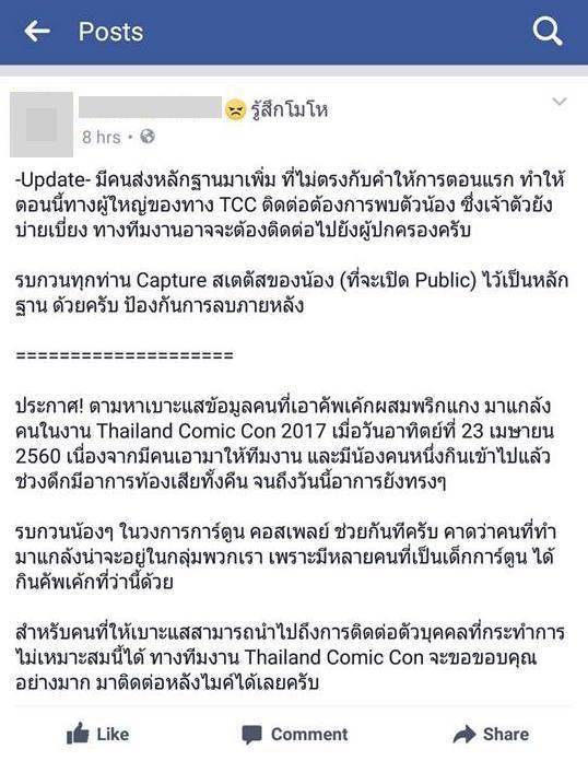วันที่ 26 เมษายน ผู้สื่อข่าวรายงานว่า สังคมออนไลน์แห่แชร์ข้อความ จากผู้ใช้เฟซบุ๊กรายหนึ่ง เป็นประกาศตามหาเบาะแส ข้อมูลคนที่ทำขนมคัพเค้กผสมพริกแกง มาแกล้งแจกคนในงาน Thailand Comic Con 2017 เมื่อวันที่ 23 เมษายนที่ผ่านมา ส่งผลให้ทีมงานและคนที่รับประทานเข้าไปมีอาการท้องเสียทั้งคืน