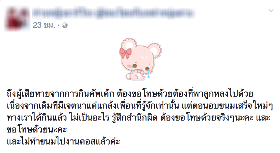 ล่าสุด มีผู้ใช้เฟซบุ๊กรายหนึ่ง อ้างว่าเป็นผู้ทำคัพเค้กผสมพริกแกง ได้ออกมาโพสต์ข้อความขอโทษผู้เสียหาย ระบุข้อความว่า “ถึงผู้เสียหายจากการกินคัพเค้ก ต้องขอโทษด้วยที่พาลูกหลงไปด้วย เนื่องจากเดิมทีมีเจตนาแค่แกล้งเพื่อนที่รู้จักเท่านั้น แต่ตอนอบขนมเสร็จใหม่ๆ ทางเราได้กินแล้ว ไม่เป็นอะไร รู้สึกสำนึกผิด ต้องขอโทษด้วยจริงๆ นะคะ และขอโทษด้วยนะคะ และไม่ทำขนมไปงานคอสแล้วค่ะ”