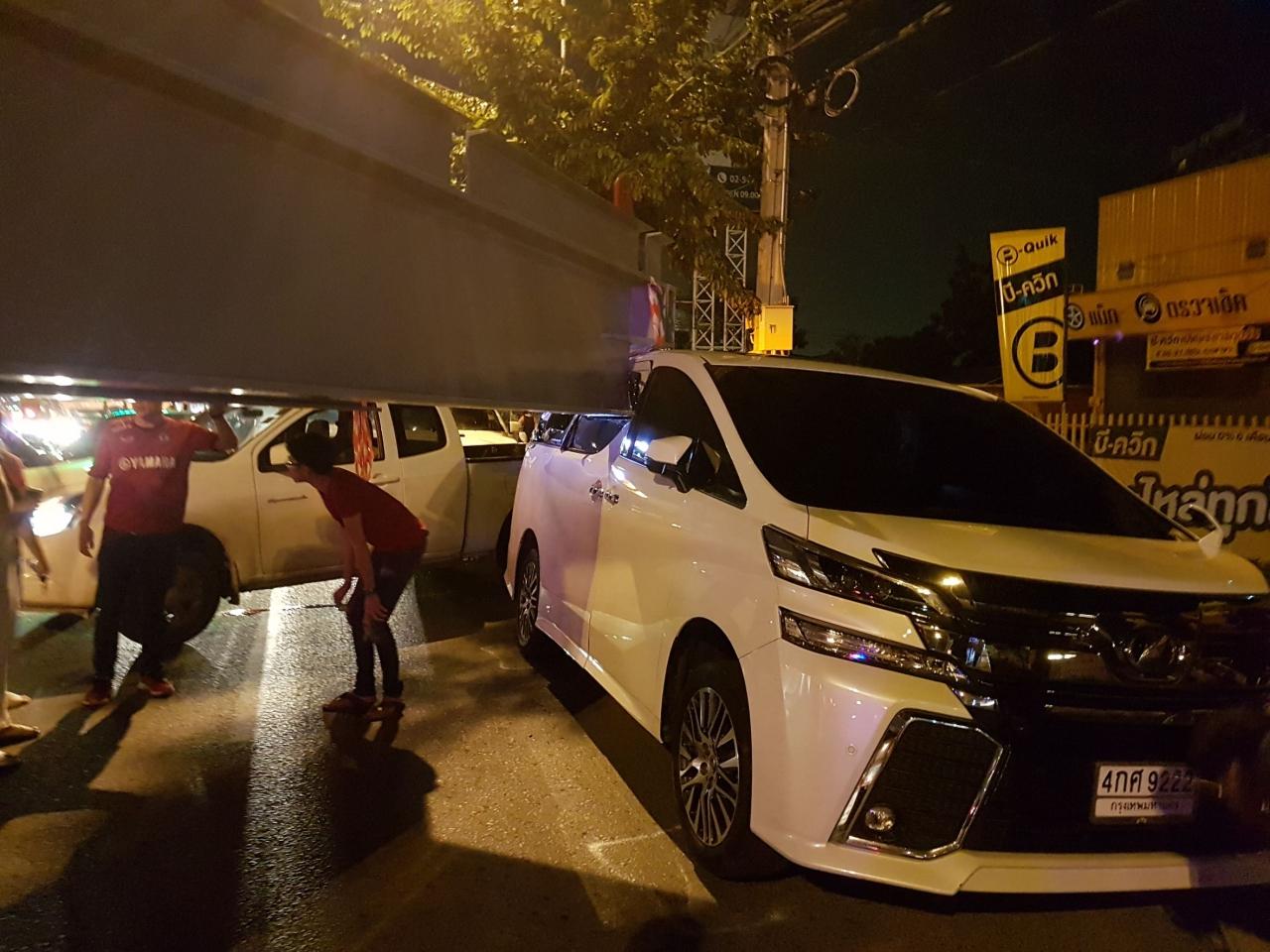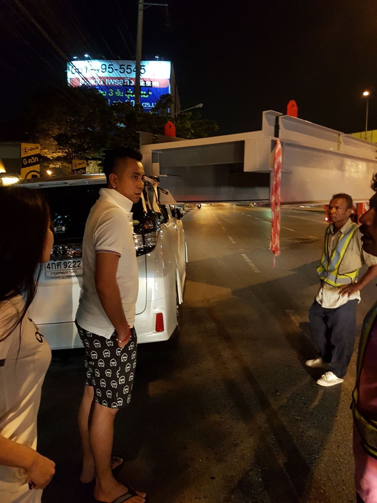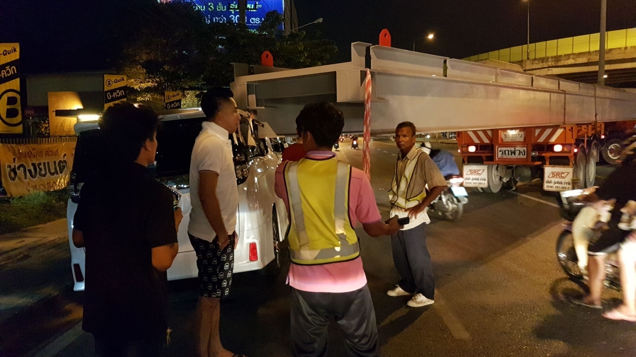เมื่อเวลา00.30น. วันที่20 พ.ค. ร.ต.ท.ชัยรัตน์ คำสุพรม รองสว.(สอบสวน)สน.บางชัน รับแจ้งเหตุรถบรรทุกพ่วง 18  ล้อชนรถยนต์ บริเวณจุดกลับรถรามอินทรา กม.9 แขวงและเขตคันนายาว กทม. จึงรุดตรวจสอบที่เกิดเหตุพร้อมเจ้าหน้าที่กู้ภัยป่อเต๊กตึง ที่เกิดเหตุเป็นจุดกลับรถอยู่เลยห้างสรรพสินค้าแฟชั่นไอส์แลนด์ 500 เมตร พบรถบรรทุก18 ล้อ หมายเลขทะเบียน 81-8970 นนทบุรี จอดลักษณะกีดขวางการจราจรทุกช่องทาง ด้านหลังบรรทุกคานสะพานรถไฟฟ้า โดยคานสะพานชนเข้ากับรถยนต์นั่งส่วนบุคคล ยี่ห้อต่อโยต้า รุ่นเวลไฟร์ สีขาว หมายเลขทะเบียน 4กศ-9222 กรุงเทพมหานคร รถได้รับความเสียหายตรงกระจกฝั่งขวาด้านหลัง ซึ่งมีนายชัชชัย จำเนียรกุล อายุ38 ปี หรือ"บอล เชิญยิ้ม" เป็นเจ้าของรถยนต์ที่ได้รับความเสียหายยืนรอให้การกับเจ้าหน้าที่