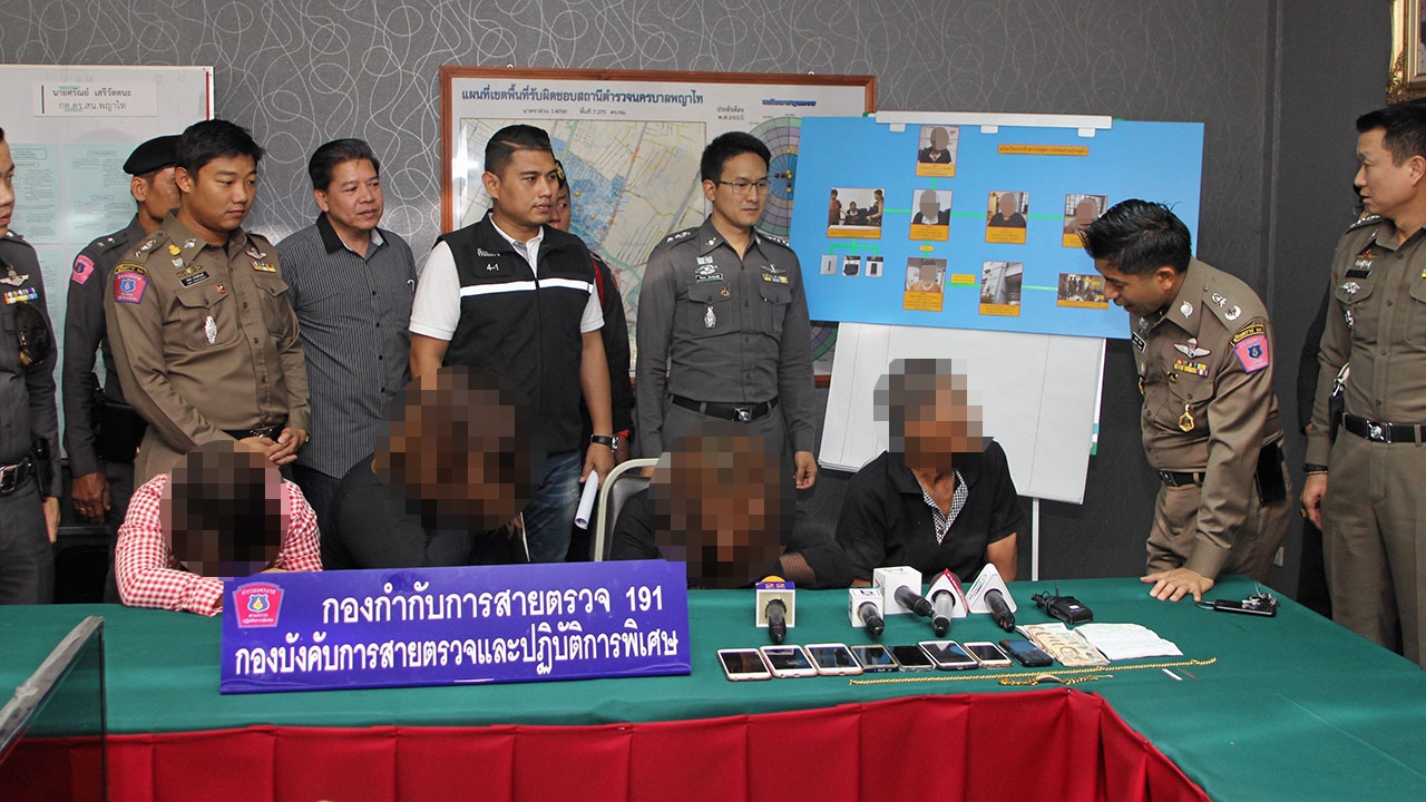 รวบแก๊งกรีดกระเป๋านักท่องเที่ยวรายนี้ เปิดเผยขึ้นที่ห้องประชุม ศปก.สน.พญาไท เมื่อเวลา 13.30 น. วันที่ 21 พ.ค. พล.ต.ต.สุรเชษฐ์ หักพาล ผบก.สปพ. พร้อมด้วย พ.ต.อ.นิธิธร จินตกานนท์ รอง ผบก.ทท. พ.ต.อ.นิติวัฒน์ แสงสิ่ง ผกก.สน.พญาไท พ.ต.ท.ปกรณ์ ภาวิไล รอง ผกก.สส.สน.พญาไท พ.ต.ท.กัมพล รัตนประทีป รอง ผกก.ศูนย์ควบคุมจราจรวิภาวดีรังสิต/ทางพิเศษ กก.2 บก.จร. พ.ต.ท.พงศ์ดนัย วิมุกติบุตร สว.สส.สน.ดินแดง ร.ต.อ.สุรสิทธิ์ อาจจำนงค์ รอง สว.สส.สน.พญาไท และ ร.ต.ต.ประสิทธิ์ คณะนัย รอง สว.สส.สน.พญาไท แถลงข่าวจับกุม น.ส.ดวง หรือดา ธิดา อายุ 35 ปีชาวกัมพูชา น.ส.เม อายุ 28 ปี ชาวกัมพูชา น.ส.อ้อย อายุ 32 ปี ชาวกัมพูชา นายฐเดช หรือต่อ นิธิธัชชัย อายุ 45 ปี ชาวไทย (สามี น.ส.ดวง) และนายสมปอง หรือดำ บุตรี อายุ 70 ปี ชาวไทยพร้อมของกลางโทรศัพท์มือถือ 8 เครื่อง เงินสด 74,790 บาท สร้อยข้อมือชุบทองคำ 1 เส้น สร้อยคอชุบทองคำ 1 เส้น และใบมีดโกน 2 ใบ จับกุมผู้ต้องหาได้บริเวณตลาดผ้าประตูน้ำข้างตึกใบหยก แขวงถนนเพชรบุรี เขตราชเทวี กทม. และบ้านเลขที่ 2029/54 นิวฟ้าใหม่อพาร์ตเมนต์ ซอยเจริญกรุง 77 แขวงวัดพระยาไกร เขตยานนาวา กทม. เมื่อวันที่ 20 พ.ค.