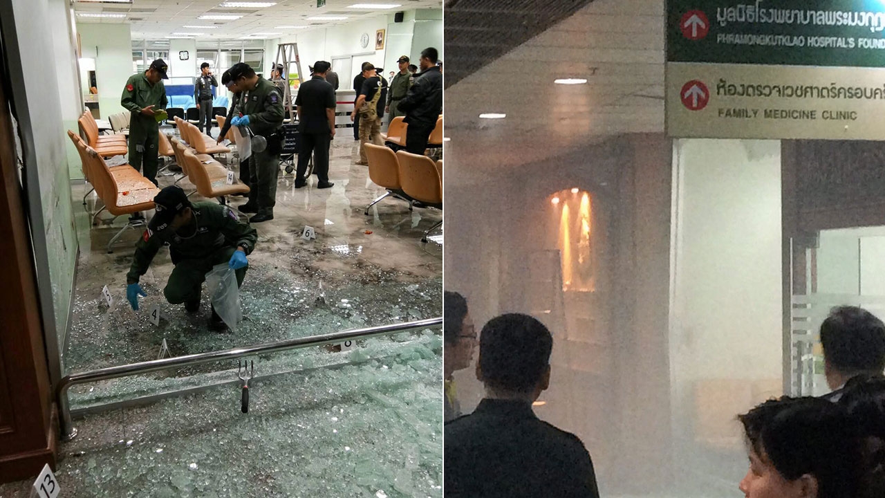เจ้าหน้าที่หน่วยเก็บกู้และตรวจพิสูจน์วัตถุระเบิด เก็บหลักฐานตรงจุดระเบิด ที่ห้องรับรองข้าราชการทหารบำนาญ (ห้องวงษ์สุวรรณ) ชั้น 1 อาคารเฉลิม พระเกียรติ 6 รอบพระชนม พรรษา รพ.พระมงกุฎฯ มีผู้บาดเจ็บ 25 คน ส่วนภาพเล็กเป็นภาพเพลิงลุกไหม้จุดเกิดเหตุ หลังระเบิดไม่นาน.