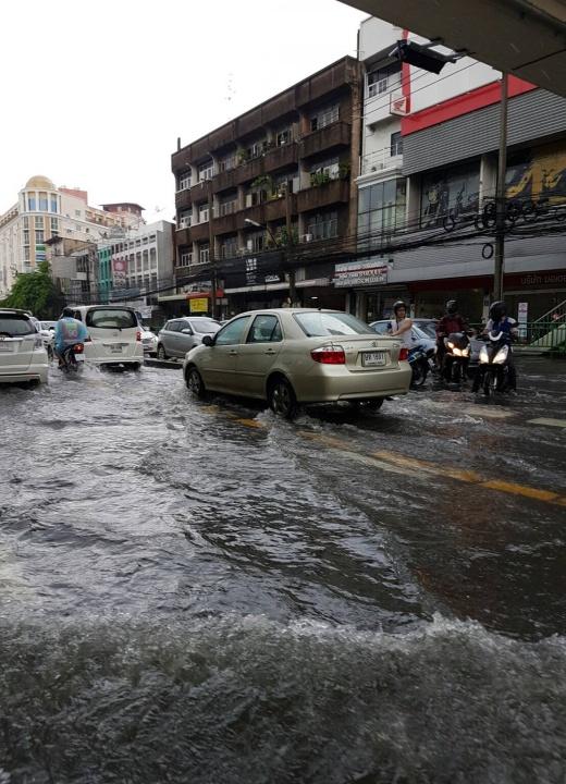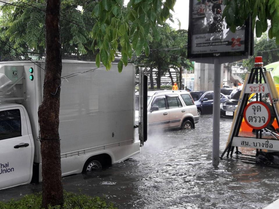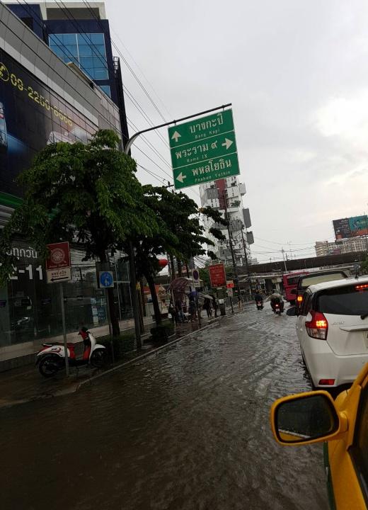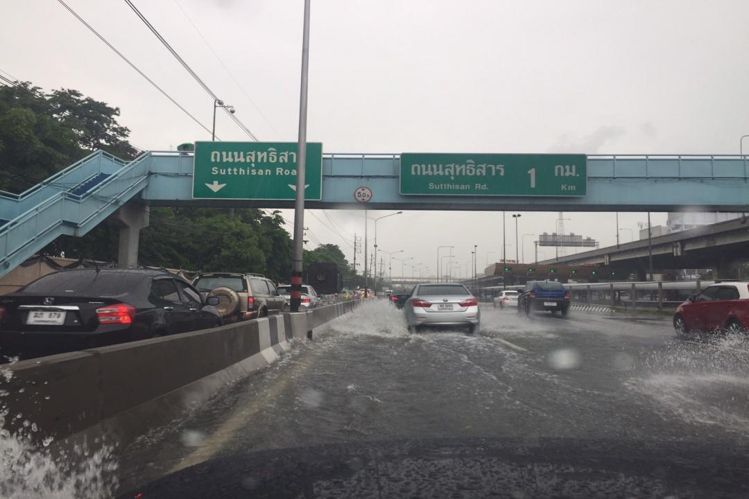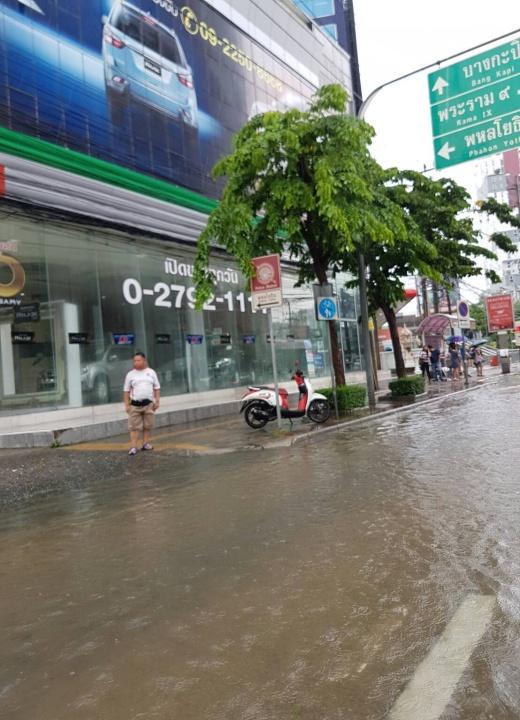 ขณะที่ ถนนวิภาวดี ขาออก ก่อนถึงแยกสุทธิสาร หน้า ร.1 พัน 1รอ. น้ำท่วมขังช่องคู่ขนานด้านซ้าย รถติดขัด ส่วนช่องทางด่วน การจราจรเคลื่อนตัวได้, บริเวณหน้าอาคารแสงโสม มีน้ำท่วมขัง ช่องทางด้านซ้าย การจราจรเคลื่อนตัวได้
