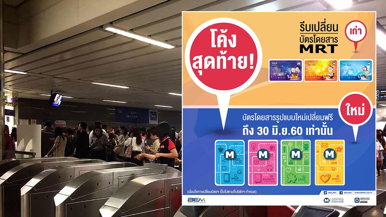 บริษัททางด่วนและรถไฟฟ้ากรุงเทพ จำกัด (มหาชน) หรือ BEM แจ้งว่า บริษัทขอแจ้งผู้โดยสาร MRT ที่ใช้บัตรโดยสารชนิดเติมเงินรูปแบบเก่าทุกประเภท มาเปลี่ยนเป็นบัตรโดยสารรูปแบบใหม่ โดยมอบสิทธิพิเศษ ฟรีค่าธรรมเนียมการออกบัตรให้ทันที และโอนค่ามัดจำบัตรและมูลค่าคงเหลือในบัตรฯ ตั้งแต่วันนี้จนถึง 30 มิ.ย.เท่านั้น ณ ห้องออกบัตรโดยสารทุกสถานี (เงื่อนไขการเปลี่ยนบัตรฯเป็นไปตามที่บริษัทฯ กำหนด) สอบถามรายละเอียดเพิ่มเติมได้ที่ศูนย์บริการข้อมูลโทร. 0-2624-5200 หรือติดตามทางเฟซบุ๊กที่ www.facebook.com/BEM.MRT ทวิตเตอร์ www.twitter.com/bem_mrt และ Mobile MRT Application (เดินทางสะดวก รวดเร็ว ด้วยรถไฟฟ้า MRT)