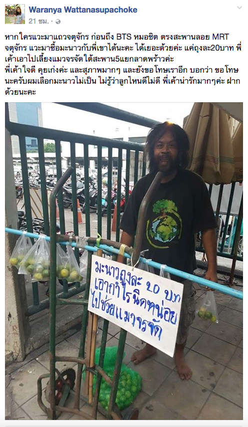 ด้าน น.ส.วรัญญา วัฒนาศุภโชค วัย 23 ปี เจ้าของเฟซบุ๊กเปิดเผยกับทีมข่าวสายตรวจโซเชียล ไทยรัฐออนไลน์ว่า ภาพนี้ตนเองถ่ายเมื่อวันที่ 30 พ.ค.เวลาประมาณ 18.00 น. บริเวณรถไฟฟ้าบีทีเอส สถานีหมอชิต ฝั่งตรงข้ามกับสวนจตุจักร ตนเองสะดุดตาตรงป้ายที่ลุงเขียนว่าหาเงินช่วยแมวจรจัด ทั้งๆ ที่เนื้อตัวมอมแมม และไม่ใส่รองเท้า ตนเองจึงอุดหนุนคุณลุงไป 2 ถุง ถุงนึงมีมะนาว 10 ลูก ซึ่งคุณลุงบอกแค่ว่า “ขอโทษนะครับ ผมเลือกมะนาวไม่ค่อยเป็น” และหลังที่ตนเองได้ลองกินมะนาวแล้ว การันตีได้เลยว่า มะนาวของลุงลูกใหญ่ น้ำเยอะ และเปรี้ยวมาก