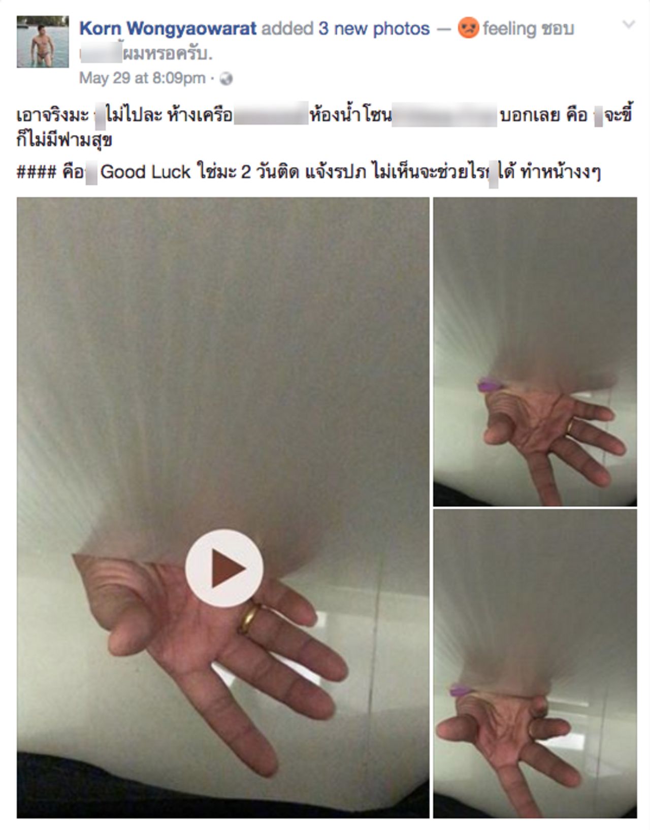 เมื่อวันที่ 31 พ.ค.60 โลกโซเชียลแห่แชร์คลิปวิดีโอจากเฟซบุ๊กที่ชื่อ Korn Wongyaowarat บันทึกภาพเหตุการณ์สุดแปลก มือปริศนาโผล่ออกมาจากห้องน้ำชายในระหว่างที่ผู้ถ่ายคลิปกำลังปลดทุกข์ในห้องน้ำ ซึ่งโพสต์ไว้เมื่อวันที่ 28 พ.ค.60 โดยผู้ถ่ายคลิประบุว่า เหตุการณ์เกิดขึ้นที่ห้างสรรพสินค้าชื่อดังแห่งหนึ่ง พร้อมเขียนข้อความ "ทำไมสังคมสมัยนี้มันน่ากลัวจัง พอฟิตเนสเสร็จ แค่มาปัสสาวะ ก็โดนดีเลย ห้างก็ออกจะหรู..."