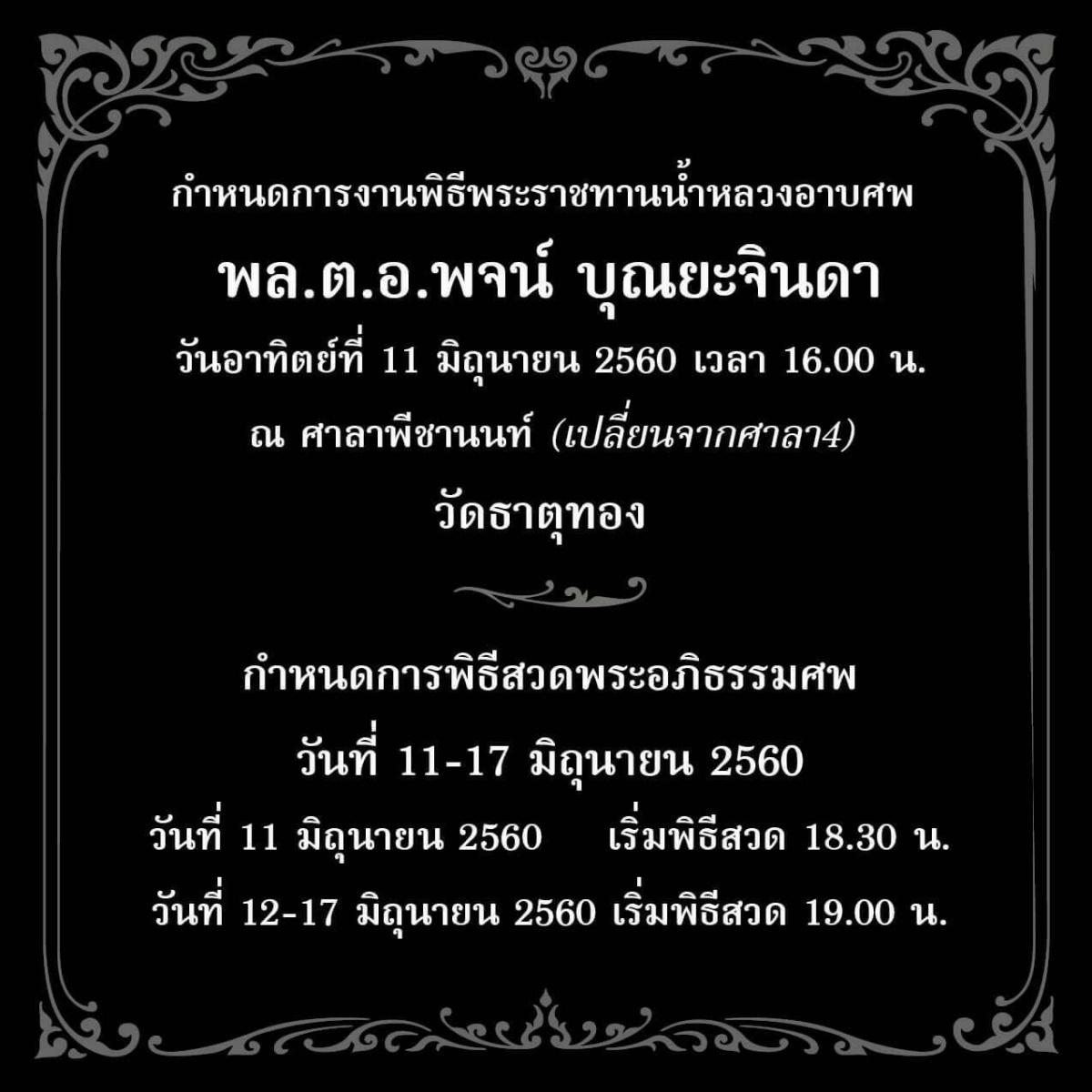 “บันเทิงไทยรัฐออนไลน์” ได้สอบถามทางคุณตุ๊กตา ผู้จัดการส่วนตัวของดัง พันกร จึงได้ทราบรายละเอียดว่า จะมีพิธีพระราชทานน้ำหลวงอาบศพ ในวันอาทิตย์ที่ 11 มิถุนายน 2560 เวลา 16.00 น. ณ ศาลาพีชานนท์ (เปลี่ยนจากศาลา 4) วัดธาตุทอง และมีกำหนดการพิธีสวดพระอภิธรรมศพ วันที่ 11-17 มิถุนายน 2560 โดยในวันที่ 11 มิ.ย. 2560 เริ่มพิธีสวด 18.30 น. ส่วนวันที่ 12-17 มิ.ย. 2560 เริ่มพิธีสวด 19.00 น.