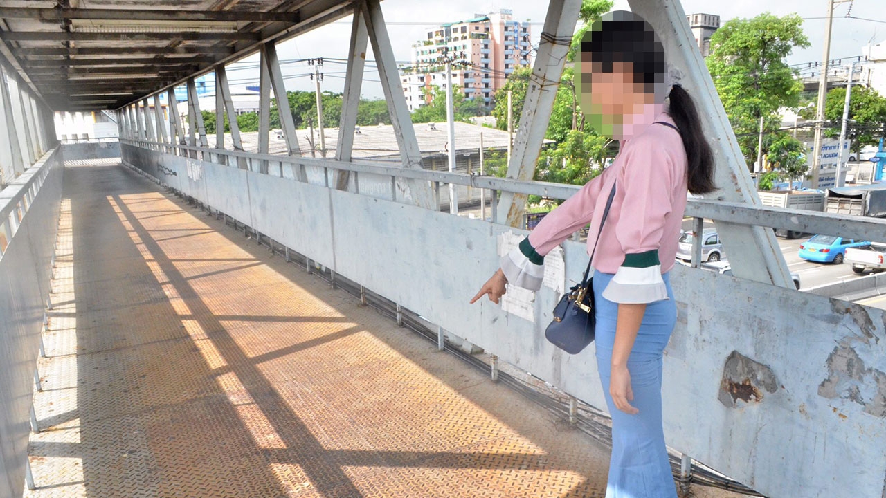 น.ส.พลอยเปิดเผยว่า ก่อนเกิดเหตุนั่งรถประจำทางมาลงป้ายรถฝั่งตรงข้ามบริษัททีโอที ขณะเดินข้ามสะพานลอยเหลือบเห็นว่ามีชายคนหนึ่งสวมหน้ากากอนามัยเดินสวนไป ตอนนั้นไม่ได้คิดอะไร ก่อนที่ชายคนดังกล่าวจะเดินกลับเข้าล็อกคอตนจากด้านหลังและกดร่างลงให้นอนราบกับพื้นสะพานลอย ก่อนคนร้ายจะพูดว่า “อย่าร้อง อย่าดิ้น พี่ไม่ทำอะไรแค่ขอจับอกหน่อย” ตนจึงบอกให้เขาปล่อยแขนที่ล็อกคอออกเพราะหายใจไม่ออก จากนั้นคนร้ายล้วงมือเข้าไปในเสื้อนานกว่า 15 นาที ตนแกล้งบอกไปว่าจะเป็นลมชัก คนร้ายตกใจเอามือออก จึงรีบฉวยโอกาสวิ่งหนีลงจากสะพานลอย