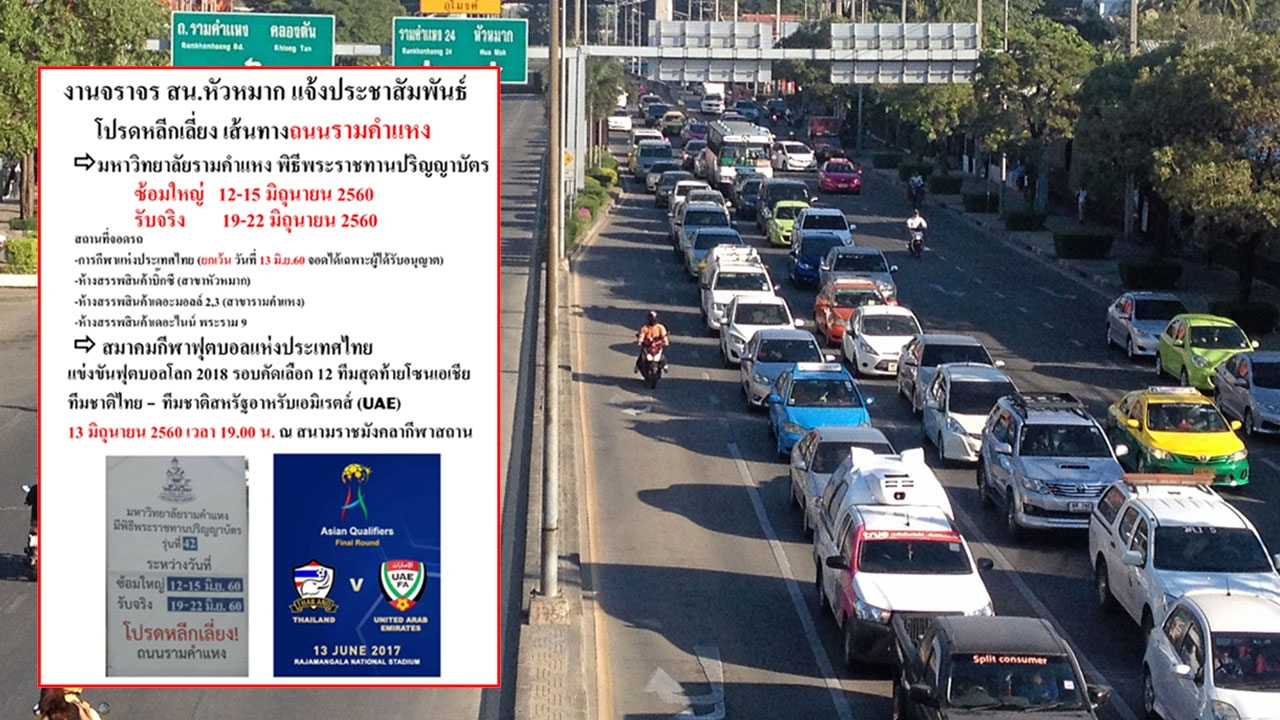 "สน.หัวหมาก" แนะเลี่ยงเส้นทางรามคำแหงวันนี้ มีซ้อมรับปริญญา ทั้งภาคเช้าและภาคบ่าย ช่วงเย็นมีแข่งขันฟุตบอลโลกรอบคัดเลือก "ไทย เจอ ยูเออี" ที่สนามราชมังคลากีฬาสถาน จราจรอาจติดขัด