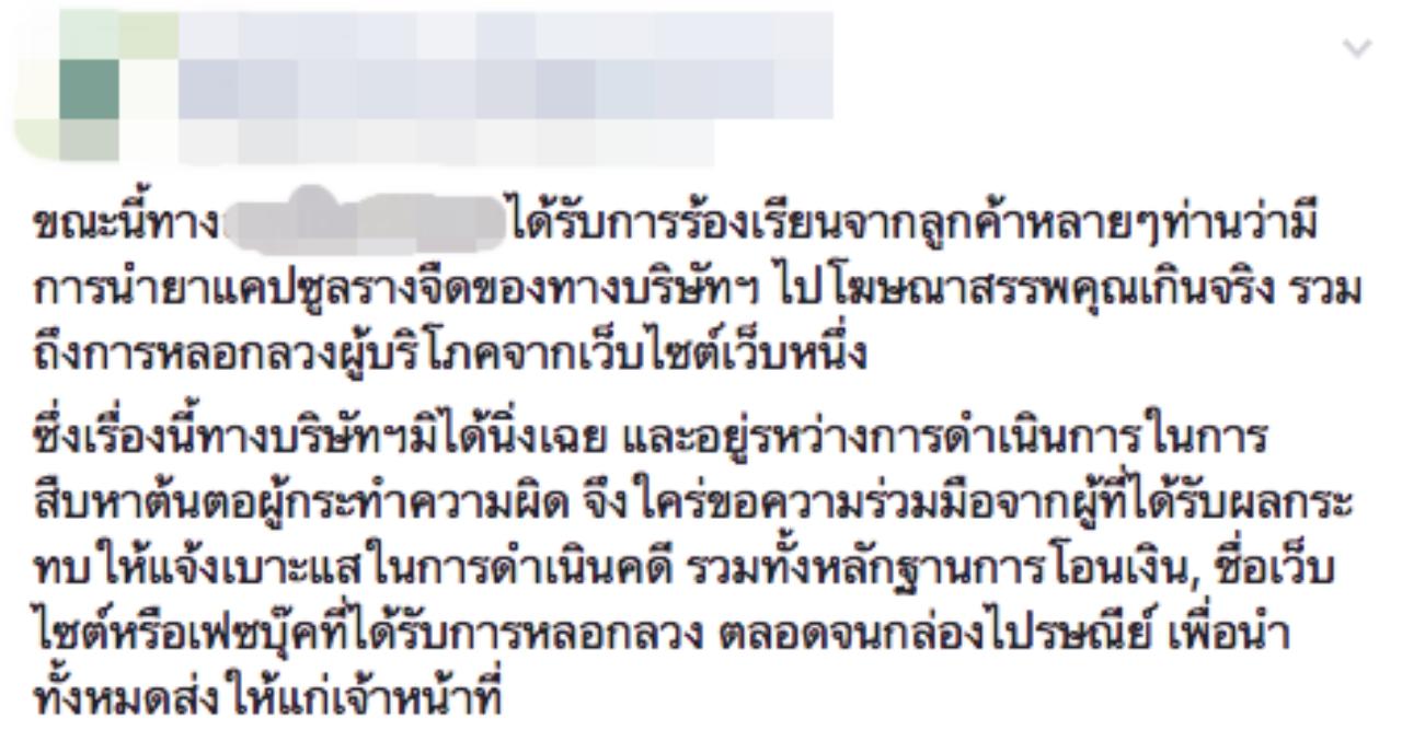 จากกรณีบริษัทผู้ผลิตยาสมุนไพรชื่อดังแห่งหนึ่ง โพสต์เตือนประชาชนลงบนเฟซบุ๊ก หลังได้รับการร้องเรียนจากผู้บริโภคหลายรายว่า มีเว็บไซต์โฆษณาขายยาแคปซูลรางจืดของทางบริษัทฯ อ้างว่าสามารถกำจัดปรสิตในร่างกายได้กว่า 120 ชนิด และขายราคาสูงกว่าหลายเท่า เข้าข่ายหลอกลวงผู้บริโภค และอยู่ระหว่างการสืบหาต้นตอผู้กระทำความผิด เพื่อดำเนินคดีตามกฎหมาย