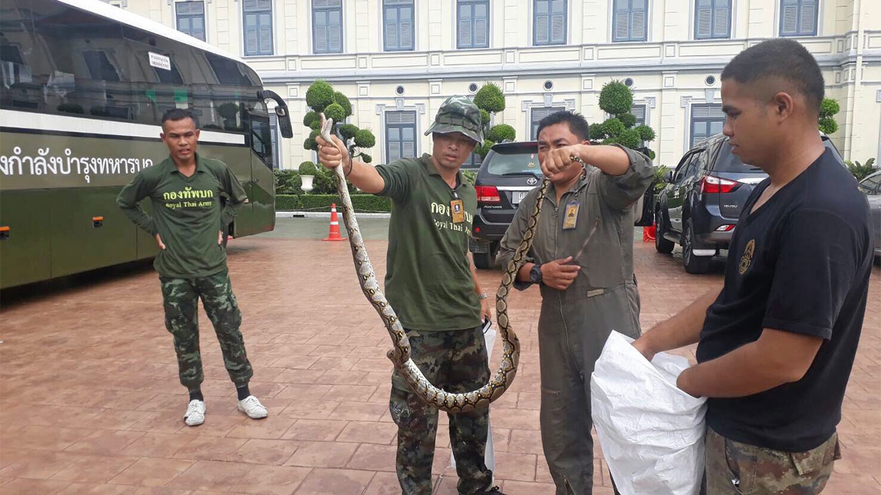เจ้าหน้าที่จับงูเหลือมขนาดใหญ่ ลำตัวยาวประมาณ 2 เมตร ที่เลื้อยออกมาจากใต้อาคารพิพิธภัณฑ์กองทัพบกมายังบริเวณลานจอดรถหน้าอาคาร บริเวณหน้าเสาธง ท่ามกลางเสียงวิพากษ์วิจารณ์ช่วงฤดูกาลโยกย้ายนายทหารประจำปี 2560.