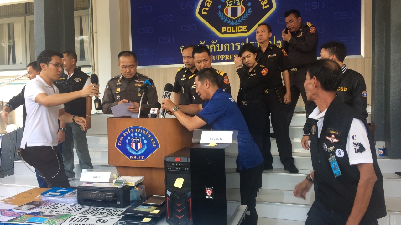กองปราบฯ จับแก๊งปลอมสมุดคู่มือจดทะเบียนและแผ่นป้ายทะเบียนปลอมรายใหญ่ เปิดเฟซบุ๊ก โฆษณารับจัดทำป้ายทะเบียนปลอมครั้งนี้ เปิดเผยขึ้นเมื่อเวลา 14.30 น. วันที่ 7 ก.ค. ที่กองบังคับการปราบปราม (บก.ป.) พล.ต.ต.สุทิน ทรัพย์พ่วง ผบก.ป. พ.ต.อ.จิรภพ ภูริเดช รอง ผบก.ป. พ.ต.อ.นิรันดร์ ปิตะกาศ ผกก.3 บก.ป. พ.ต.ท.วิวัฒน์ จิตโสภากุล รอง ผกก.3 บก.ป. พร้อมด้วยนายสุกรี จารุภูมิ ผู้อำนวยการกองตรวจขนส่งทางบก ร่วมกันแถลงข่าวจับกุมผู้ต้องหาคดีปลอมแปลงเอกสารทางราชการ ทั้งหมด 5 ราย ประกอบด้วย นายณัทฐ์วัฒน์ หรือต้น งามเลิศศุภร อายุ 23 ปี (หัวหน้าแก๊ง ทำหน้าที่ควบคุมสั่งการผลิต) และ น.ส.สุชาดา สูงเสริฐ อายุ 24 ปี (ดูแลการเงิน) จับกุมได้ที่บ้านเลขที่ 335/335 หมู่ที่ 4 หมู่บ้านพฤกษาวิลล์ ถ.หนามแดง-บางพลี ต.บางพลีใหญ่ อ.บางพลี จ.สมุทรปราการ นายรดาการ บริบูรณ์ อายุ 24 ปี (ดูแลเฟซบุ๊กชื่อ บัญชา โคตรขำ) จับกุมได้ที่บ้านเลขที่ 126/29 หมู่บ้านเฟื่องฟ้าวิลล่า โครงการ 11 เฟส 1 ต.แพรกษาใหม่ อ.เมืองสมุทรปราการ นายสนธยา หรือสี่ จันทร์เพ็ญสว่าง อายุ 31 ปี (รับสวมซากรถ โอนรถผิดกฎหมาย) จับกุมได้ที่ปั๊มน้ำมันซัสโก้ สาขาพหลโยธิน นายวุฒิชัย ซุ้มมหาวงศ์ อายุ 60 ปี (ทำแผ่นป้ายและสำเนาคู่มือทะเบียนปลอม) จับกุมได้ที่บ้านเลขที่ 1 แขวงบางแวก เขตภาษีเจริญ พร้อมของกลาง เอกสารทางราชการปลอม สมุดเล่มทะเบียนรถปลอม ป้ายทะเบียนปลอม รถยนต์ยี่ห้อเบนซ์ สีดำ ทะเบียน 3 กย 9265 และรถยนต์ยี่ห้อเบนซ์อีก 1 คัน
