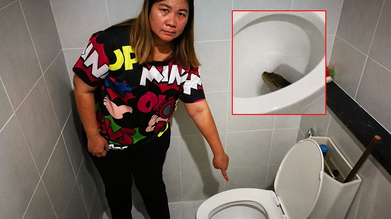น.ส.พนารัตน์ ไชยบูรณ์ ชี้ชักโครกในห้องน้ำ ชั้นล่างของบ้านในหมู่บ้านจัดสรร ย่านตลิ่งชัน เป็นจุดงูเหลือมโผล่ออกมากัดก้นขณะปลดทุกข์ ส่วนภาพเล็ก เป็นภาพงูเหลือมอีกตัวโผล่จุดเดิมขณะลูกสาวเข้าไปล้างมือ ทำให้คนผวา ไม่กล้าเข้าห้องน้ำ.