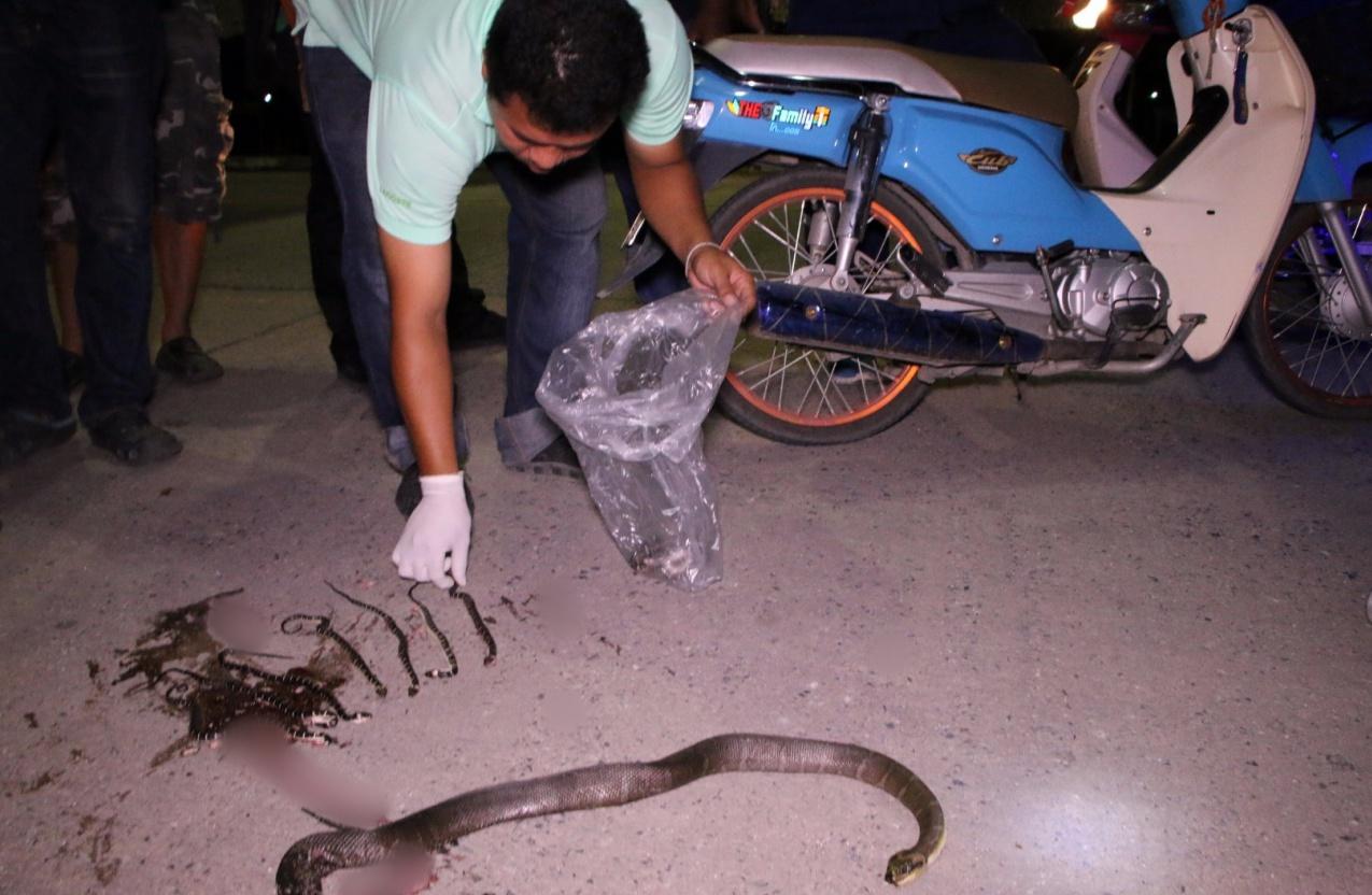 เวลา 04.30 น. วันที่ 10 ก.ค. หน่วยกู้ภัยฉะเชิงเทรา รับแจ้งจากชาวบ้านว่ามีงูไม่ทราบชนิด ถูกรถทับบริเวณหน้าร้านก๋วยเตี๋ยวไก่มะระ ใกล้สี่แยกท่าสะอ้าน ถนนจรัญยานนท์ หมู่ 7 ต.ท่าสะอ้าน อ.บางปะกง จ.ฉะเชิงเทรา เมื่อไปถึงพบว่าเป็น งูเหลือมอ้อหรืองูหัวกะโหลก ที่ไม่มีพิษ ยาวประมาณ 1.30 เมตรนอนอยู่กลางถนน บริเวณลำตัวถูกรถทับจนหลังหัก แล้วมีลูกงูเหลือมอ้อจำนวน 4 ตัวทะลักออกมา เจ้าหน้าที่พยายามจะเข้าไปช่วย แต่มีรถที่สัญจรบนถนนใช้ความเร็วมากเกรงว่าจะเกิดอันตราย จึงรีบจับแม่และลูกนำออกมา พบว่ายังมีลูกงูเหลือมอ้ออีกหลายตัวอยู่ในท้อง