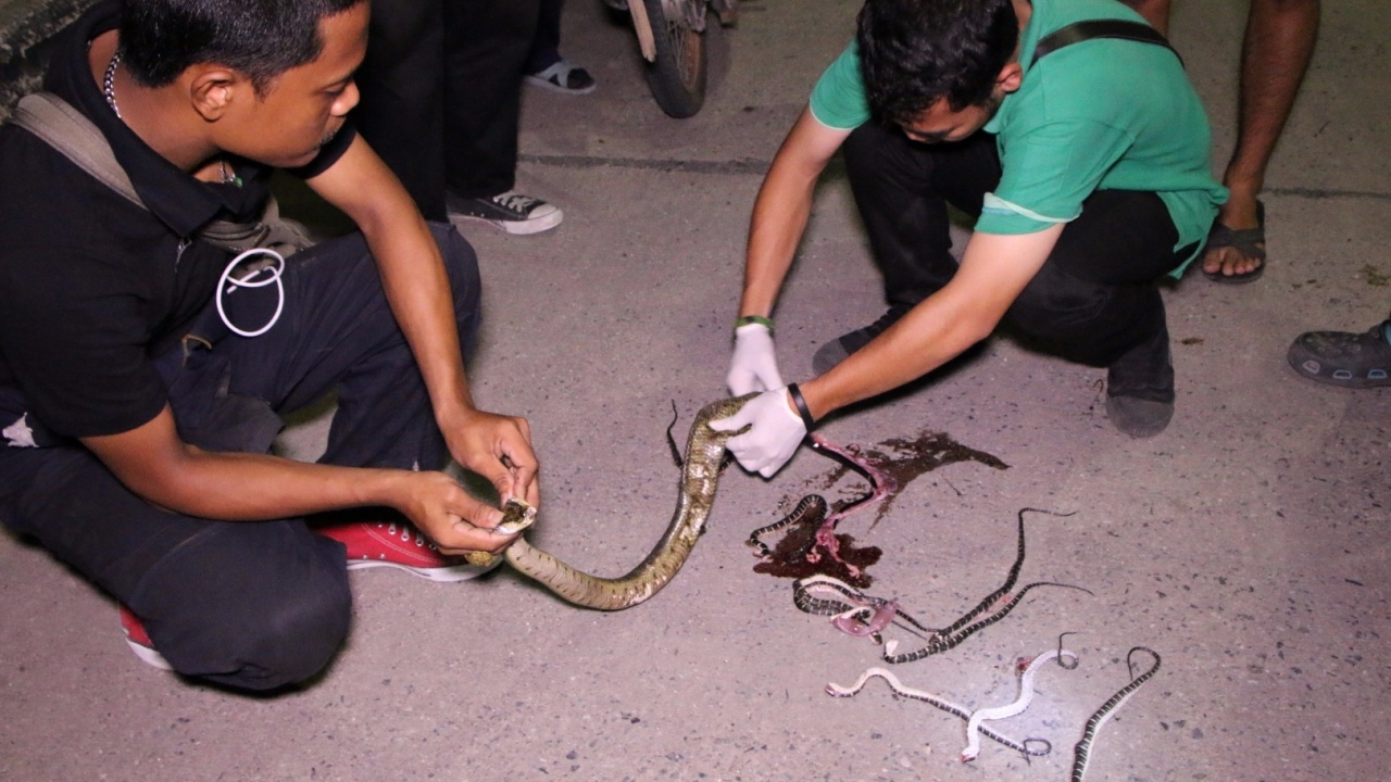 ทางกู้ภัยเห็นว่า ลูกงูบางตัวยังมีชีวิตจึงช่วยกันอยู่ประมาณ 10 นาที สามารถนำลูกงูเหลือมอ้ออีก 8 ตัวออกมาจากท้องได้ทั้งหมด รวมมีลูกงู 12 ตัว ตายเสีย 11 ตัว เหลือรอดชีวิตเพียงตัวเดียว รวมทั้งแม่งูเหลือมอ้อได้ตายในเวลาต่อมา เพราะถูกรถทับหลังหัก ซึ่งทางกู้ภัยได้นำซากลูกงูเหลือมอ้อแม่ลูกรวม 12 ตัวไปฝังไว้ที่เดียวกัน ส่วนลูกงูเหลือมอ้อที่รอดตาย ได้นำมาพักฟื้นไว้ เพื่อเตรียมปล่อยคืนสู่ธรรมชาติต่อไป