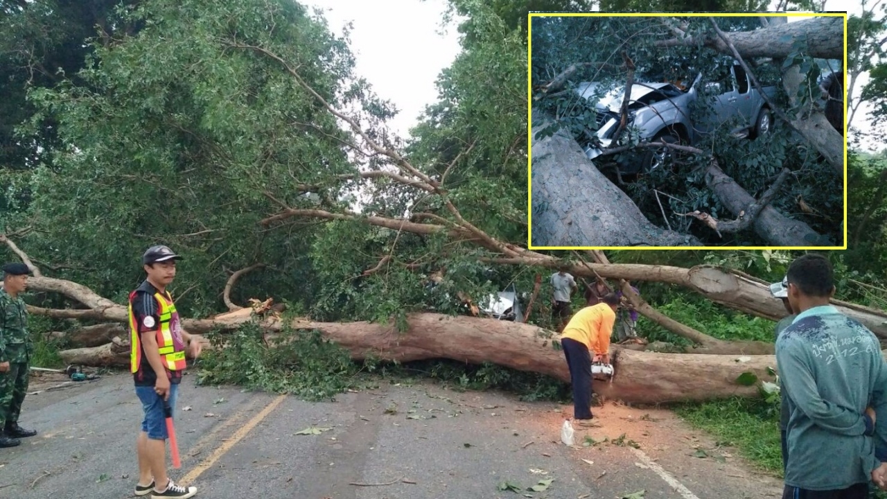 แก๊งมอดไม้เหิมหนัก ลักลอบตัดต้นพะยูงใหญ่เส้นผ่าศูนย์กลางเกือบ 3 เมตร ข้างถนนสายหลัก ทำพลาดต้นไม้ล้มขวางทางขนย้ายออกไม่ได้ สองผัวเมีย ดวงซวยขับรถจะไปตลาดซื้ออาหารสดมาขาย ชนเข้าอย่างจังได้รับบาดเจ็บ ส่วนคนร้ายรีบเก็บอุปกรณ์หนี...