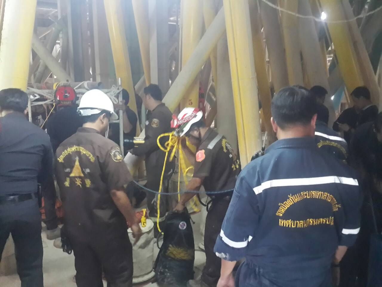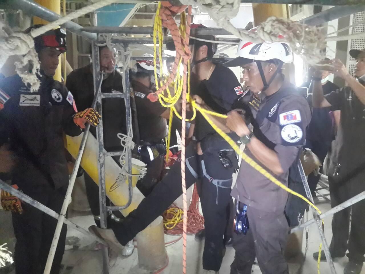ขณะเดียวกัน ทางด้านหมวดตรีเอกพันธุ์ คุปตวัช นายกเทศมนตรีนครนครปฐม ได้จัดเจ้าหน้าที่หน่วยกู้ภัยชุดโรยตัวสูงจากเทศบาลนครปฐมนครปฐม เพื่อทำการช่วยเหลือ โดยมีนายธิติชัย เจียมรุ่งรัศมี ลงไปสำรวจภายในท่อคนแรก พร้อมถังออกซิเจน ซึ่งต้องเตรียมไว้ถึง 4 ถัง เนื่องจาก 1 ถังสามารถอยู่ได้เพียง 45 นาที เจ้าหน้าที่จึงต้องเร่งเวลาในการทำภารกิจเพื่อให้ใช้เวลาไม่เกิน 30 นาที และเหลืออีก 15 นาที เพื่อปีนขึ้นด้านบน นอกจากนี้ ถังยังมีความกว้างเพียง 1 เมตร ภายในมีฝุ่นแป้งวัตถุดิบผลิตอาหารสัตว์ และมืดมาก จึงต้องวางแผนอย่างดีเพื่อความปลอดภัย