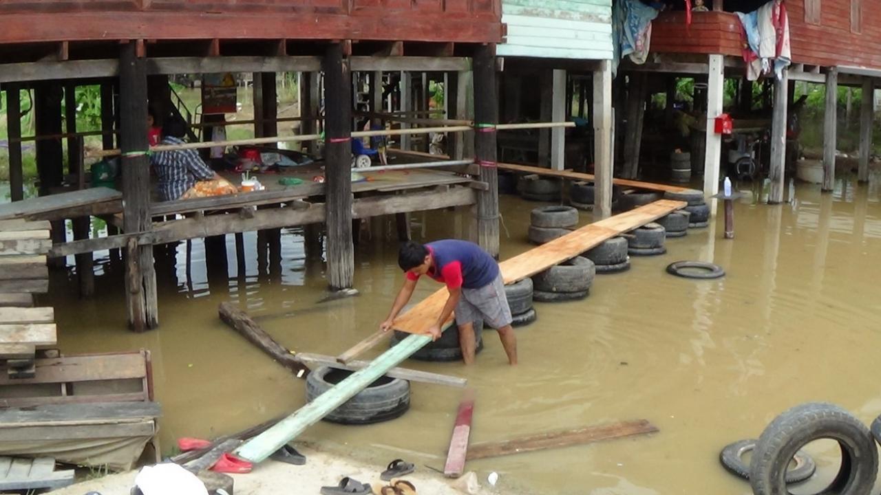 วันที่ 15 ก.ค.60 ผู้สื่อข่าวรายงานว่า บริเวณริมตลิ่งแม่น้ำน้อย ม.9 ต.บางจัก อ.วิเศษชัยชาญ จ.อ่างทอง มีน้ำเอ่อล้น เข้าท่วมบ้านเรือนที่อาศัยอยู่ติดริมแม่น้ำจำนวน 103 หลังคาเรือน โดยชาวบ้านได้กำลังเร่งสร้างสะพานทางเดินเข้าบ้านและยกของขึ้นที่สูง รวมทั้งมีการขนย้ายรถยานพาหนะขึ้นไปจอดในที่สูง และต้องจัดเฝ้าเวรยาม เพราะหวั่นถูกขโมย พร้อมกับเฝ้าฟังสถานการณ์น้ำตลอด 24 ชั่วโมง