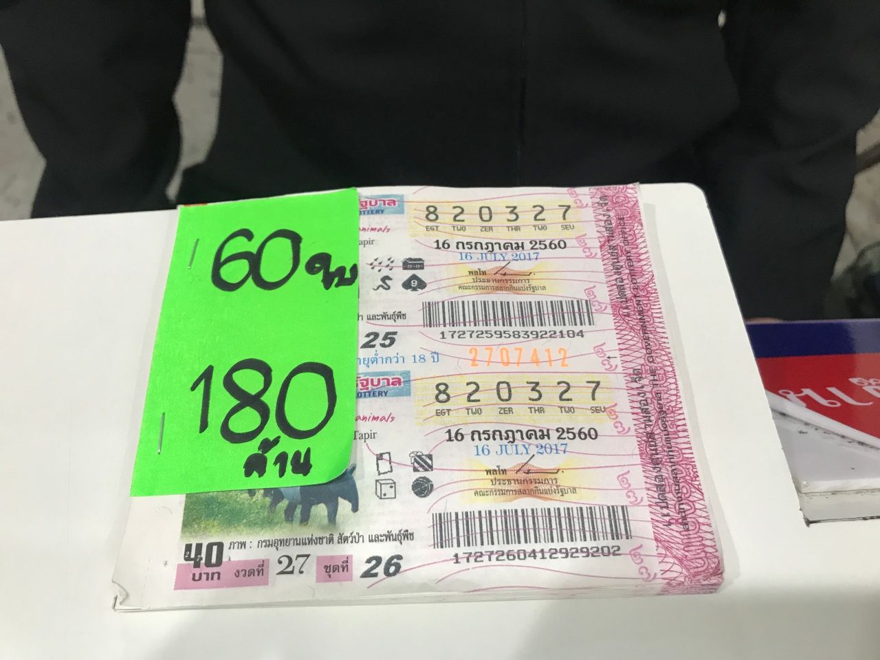 ภายหลังขึ้นโรงพัก สภ.รัตนาธิเบศร์ จ.นนทบุรี เมื่อตอนเย็นวันที่ 16 ก.ค.60 แจ้งความประสงค์กับ ร.ต.ท.หญิงอินทุพร ชุลีจันทร์ รอง สว.(สอบสวน) ขอลงประจำวันไว้เป็นหลักฐานว่า พ.ต.อ.ศรศักดิ์ แก้วรักษา อดีตรอง ผบก.ปปป. ได้ ถูกสลากกินแบ่งรัฐบาล หมายเลข 820327 งวดประจำวันที่ 16 ก.ค.60 จำนวน 60 ใบ 30 คู่ ได้เงินรางวัลทั้งสิ้น 180 ล้านบาท สูงสุดเป็นประวัติการณ์ของสลากกินแบ่งรัฐบาลไทย