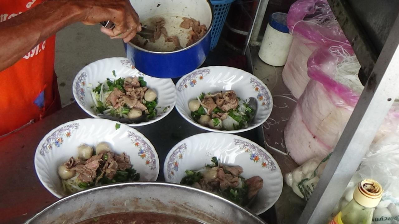 นายบุญชอบ โตประเทศ อายุ 72 ปี กล่าวว่า ตนเอง ได้ทำอาชีพขายก๋วยเตี๋ยวมานานแล้ว 42 ปี โดยที่ทางร้านมีให้เลือกเส้น 2 อย่าง คือ เส้นเล็กและเส้นหมี่ เป็นก๋วยเตี๋ยวเนื้อรสเด็ด ในแต่ละวันจะใช้วัตถุดิบเป็น เส้นเล็ก 10 กิโลกรัม เส้นหมี่ 10 กิโลกรัม เนื้อวัว 10 กิโลกรัม ลูกชิ้นเนื้อ 10 กิโลกรัม กากหมู 10 กิโลกรัม ถั่วงอก 10 กิโลกรัม จะทำการขายได้วันละ 300 ชาม เริ่มขับรถสกายแล็บที่ติดตั้งพ่วงรถเข็นขายก๋วยเตี๋ยวไว้ด้านหลัง นำออกจากบ้านมาจอดรถบริการขายให้กับลูกค้าที่ร้านเพิงไม้สังกะสีที่อยู่ริมถนน สายโพธิ์ทอง–วิเศษชัยชาญ ตั้งแต่ เวลา 07.30-13.30 น. ของทุกวัน