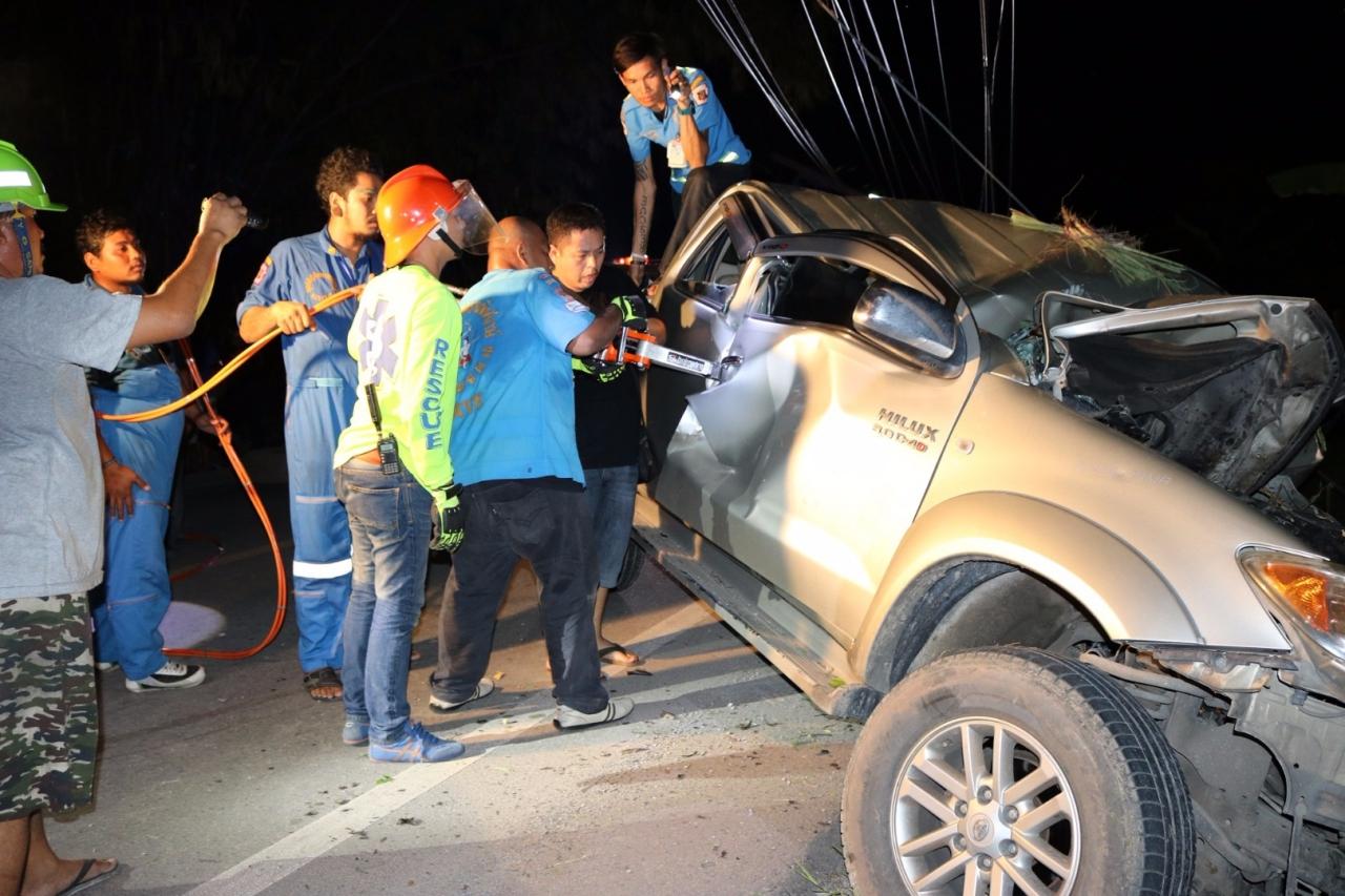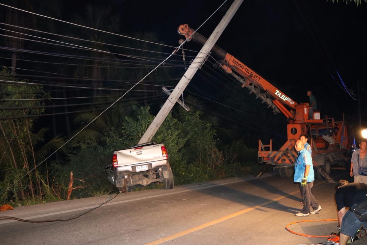 เสี่ยโรงกลึงขับกระบะแหกโค้งชนเสาไฟฟ้าหักล้มถึง 3 ต้น ดับคาที่ ที่ อ.สามพราน เจ้าหน้าที่การไฟฟ้าต้องตัดกระแสไฟ และนำเครนมายกเสาไฟฟ้าที่ล้มทับรถ พังยับเยิน