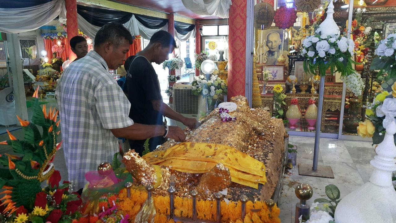 สำหรับประวัติหลวงพ่อขอม มรณภาพเมื่อวันที่ 7 ม.ค.2533 สิริรวมอายุ 88 ปี 68 พรรษา ปัจจุบันสรีระหลวงพ่อขอม สังขารยังคงสภาพเดิม บรรจุอยู่ในโลงแก้ว และในวันอังคารที่ 8 ก.ค.60 เป็นวันทิ้งทานเทกระจาด จะมีการแห่รูปเหมือนหลวงพ่อขอมไปยังบริเวณที่ทิ้งทาน โดยมีพระเดชพระคุณพระธรรมพุทธิมงคล เจ้าอาวาสวัดป่าเลไลยก์ ที่ปรึกษาเจ้าคณะจังหวัดสุพรรณบุรี เป็นประธานฝ่ายสงฆ์ ว่าที่ ร.ต.สุพีร์พัฒน์ จองพานิช ผวจ.สุพรรณบุรี เป็นประธานฝ่ายฆราวาส