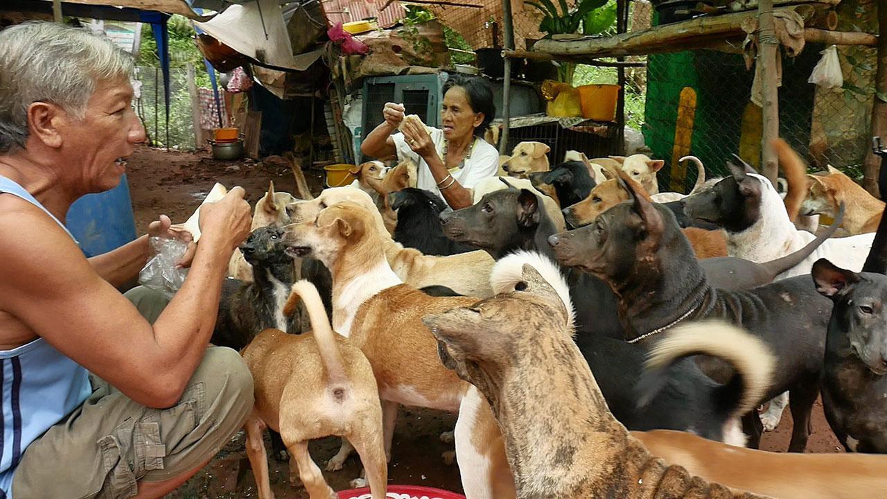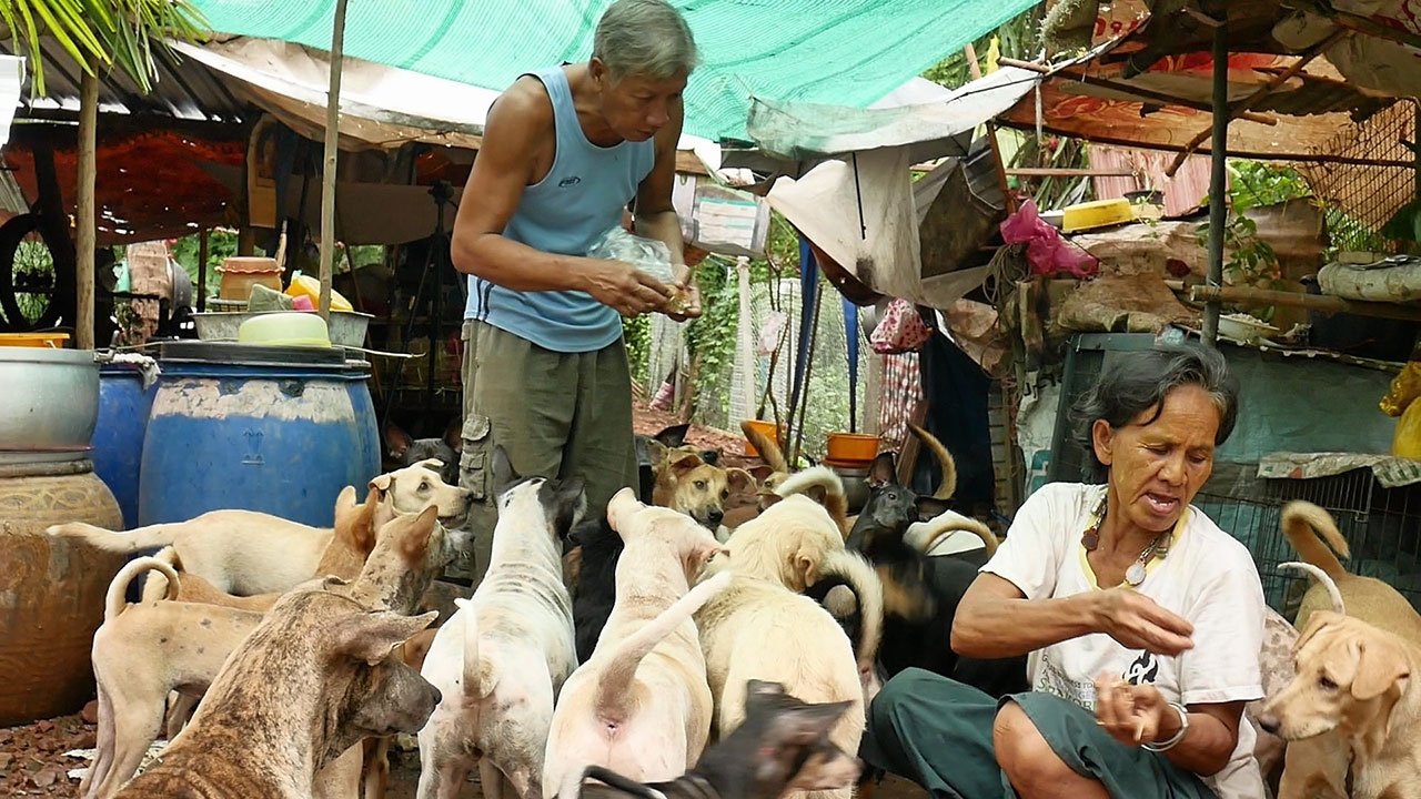 คนรักหมา!! พบสองตายายใจบุญ สู้เพื่อหมา แม้ตัวเองจะยากจนข้นแค้น อาศัยร่องสวนเชิงสะพานข้ามแม่น้ำแม่กลองเป็นที่เลี้ยง ด้วยความรักและสงสารจึงนำหมาจรจัด หมาถูกทิ้งมาเลี้ยง และทำแบบนี้กว่า 5 ปีแล้ว มีชาวบ้านใจบุญที่เห็นใจบ้าง เห็นความตั้งใจ ซื้ออุปกรณ์ ไม้ สังกะสี ให้ปลูกเพิงพัก ขึงลวดตาข่าย เพื่อกั้นไม่ให้ออกมาถูกรถชน...