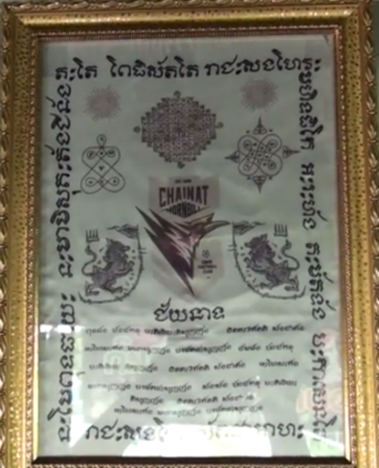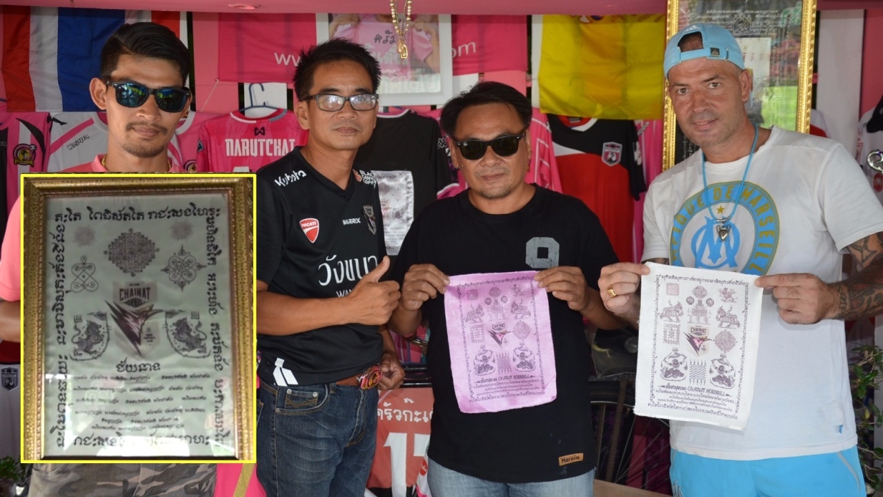 วันที่ 25 ก.ค.60 จากกรณีที่ ทีมฟุตบอล ชัยนาท ฮอร์นบิล ทำสถิติไม่แพ้ติดต่อกันมาแล้วถึง 9 นัด ด้วยฝีมือผสมกับความศรัทธาที่ทางแฟนคลับช่วยกันคิดค้นทำยันต์กันแพ้ หวังให้มีโชคมาให้กับจังหวัดชัยนาท ซึ่งหลังจากทำยันต์ดังกล่าวขึ้นมา ทีมชัยนาทก็ไม่แพ้จริงๆ ไม่ว่าจะเตะในบ้านหรือนอกบ้าน โดยทั้งผู้จัดการทีม นักฟุตบอล ได้มารับมอบผ้ายันต์จาก นายวิเชียร สมศรี เจ้าของร้านก๊ะเตี๋ยว บ้าบอล ที่เป็นแฟนคลับตัวยงของทีมชัยนาท ฮอร์นบิล ไปติดที่ห้องแต่งตัว และพกติดตัวเวลาไปแข่ง จนขณะนี้มีบรรดาแฟนคลับและผู้ที่สนใจมาขอผ้ายันต์ดังกล่าวไปบูชากันมาก จนต้องทำรุ่นที่ 2 ออกมาแจกจ่ายแก่ผู้ที่ศรัทธา