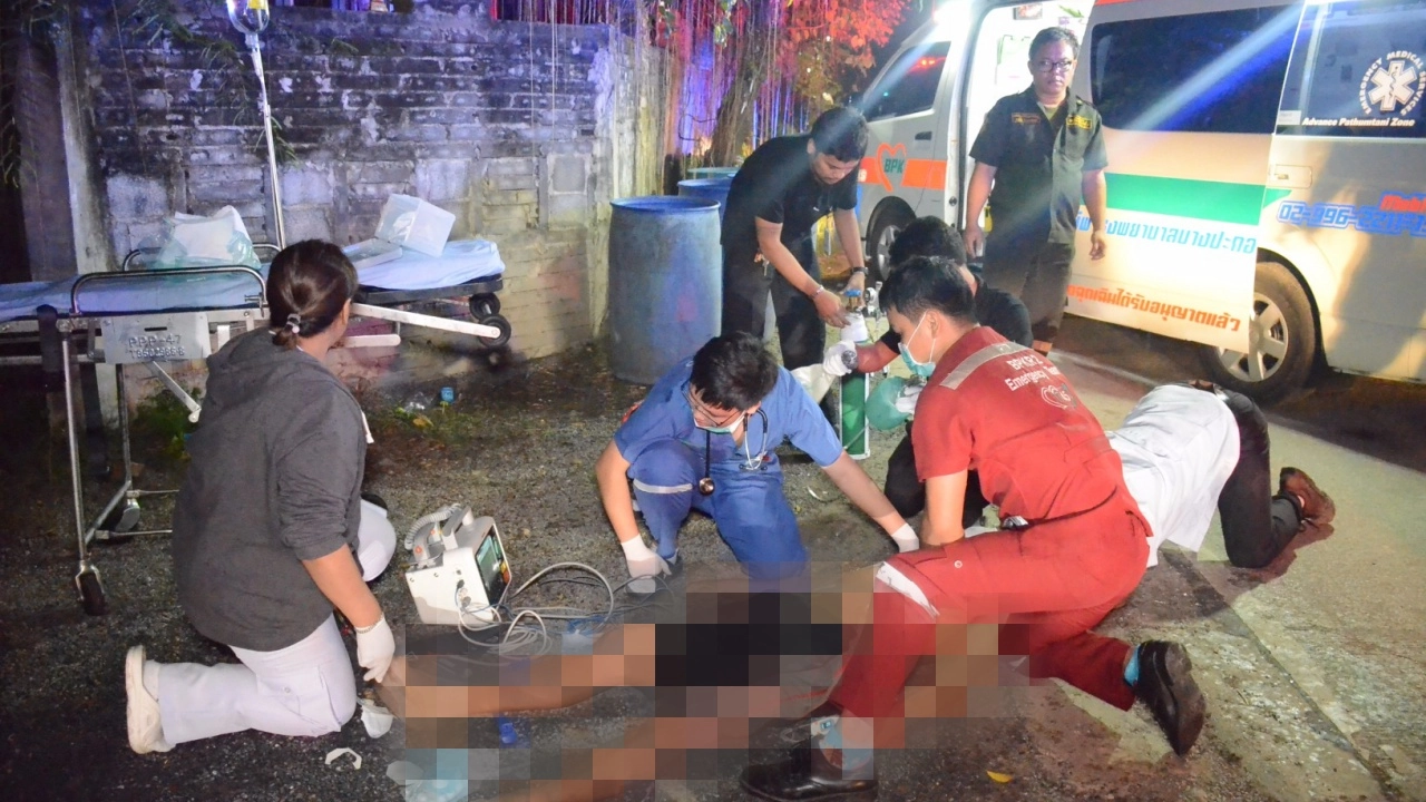 ในที่เกิดเหตุ บริเวณประตูข้างวัดจันทรสุข เจ้าหน้าที่พบ นายสมพง พิมสำโรง อายุ 53 ปี บ้านเลขที่ 139 หมู่ 9 ต.อุดมทรัพย์ อ.วังน้ำเขียว จ.นครราชสีมา สภาพนอนหงายมีเลือดไหลที่บริเวณศีรษะ ลำคอปวดบวม เจ้าหน้าที่กู้ชีพ วัดชีพจรหยุดเต้นแล้ว จึงได้ช่วยกันปั้มหัวใจนานกว่า 30 นาที จนหัวใจเริ่มเต้น จึงได้รีบดำเนินการนำตัว ส่ง รพ.ปางปะกอกรังสิต 2 เป็นการด่วน จากการตรวจสอบโดยรอบพบไม้ก้านร่ม ขนาดเส้นผ่าศูนย์กลางประมาณ 1 นิ้ว หัก 2 ท่อนตกอยู่ และห่างไปพบโทรศัพท์ของผู้ได้รับบาดเจ็บตกอยู่ เจ้าหน้าที่จึงได้เก็บไว้เป็นหลักฐาน