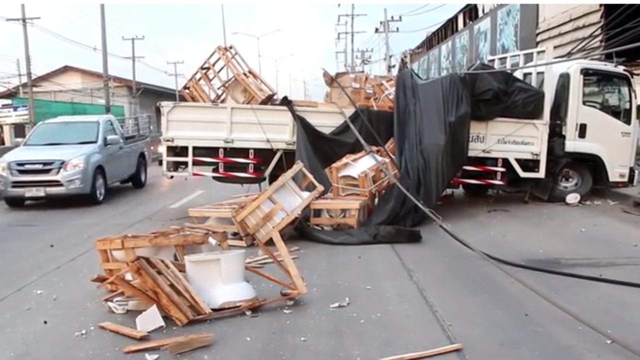 เกิดอุบัติเหตุรถหกล้อบรรทุกชักโครก เสียหลักชนเสาไฟฟ้าแรงสูงริมถนนรังสิต-ปทุมธานีหัก สินค้าที่บรรทุกมาตกแตกกระจายบนถนน เสียการจราจรไป 1 ช่องทาง ทำรถติดยาว ส่วนคนขับหลบหนี...