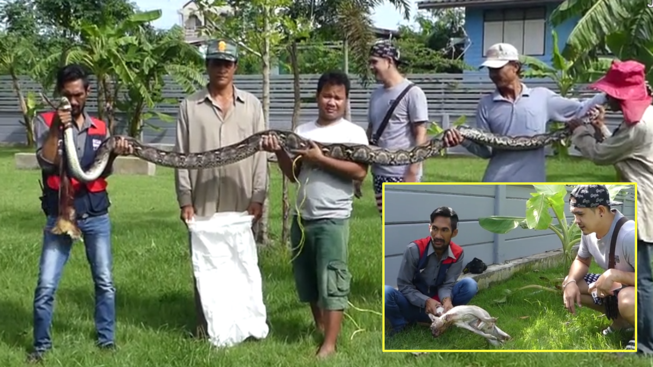 สาวคนสวนหมู่บ้านที่สามโคก ปทุมธานี เห็นท่อนไม้วางอยู่บนพื้นหญ้า เดินจะไปหยิบ ปรากฏว่าเป็นงูเหลือมยักษ์ยาว 5 เมตร หิวโซลอบเข้ามาเขมือบแมว เรียกคนงานเอาเชือกกล้วยคล้องคอ ก่อนจับมัด พบงูขย้อนแมวออกมาจากท้อง...