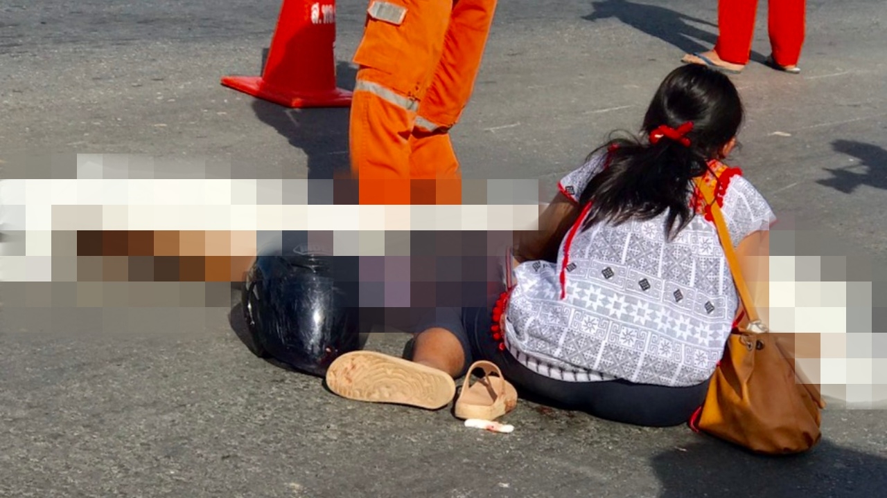แม่ร่ำไห้ ลูกชายขี่จักรยานยนต์พาแม่จะไปไหว้ยาย เกิดเฉี่ยวกับรถจักรยานยนต์อีกคันจนรถล้ม ถูกรถ 6 ล้อบรรทุกน้ำอัดลม ทับดับกะโหลกแตก